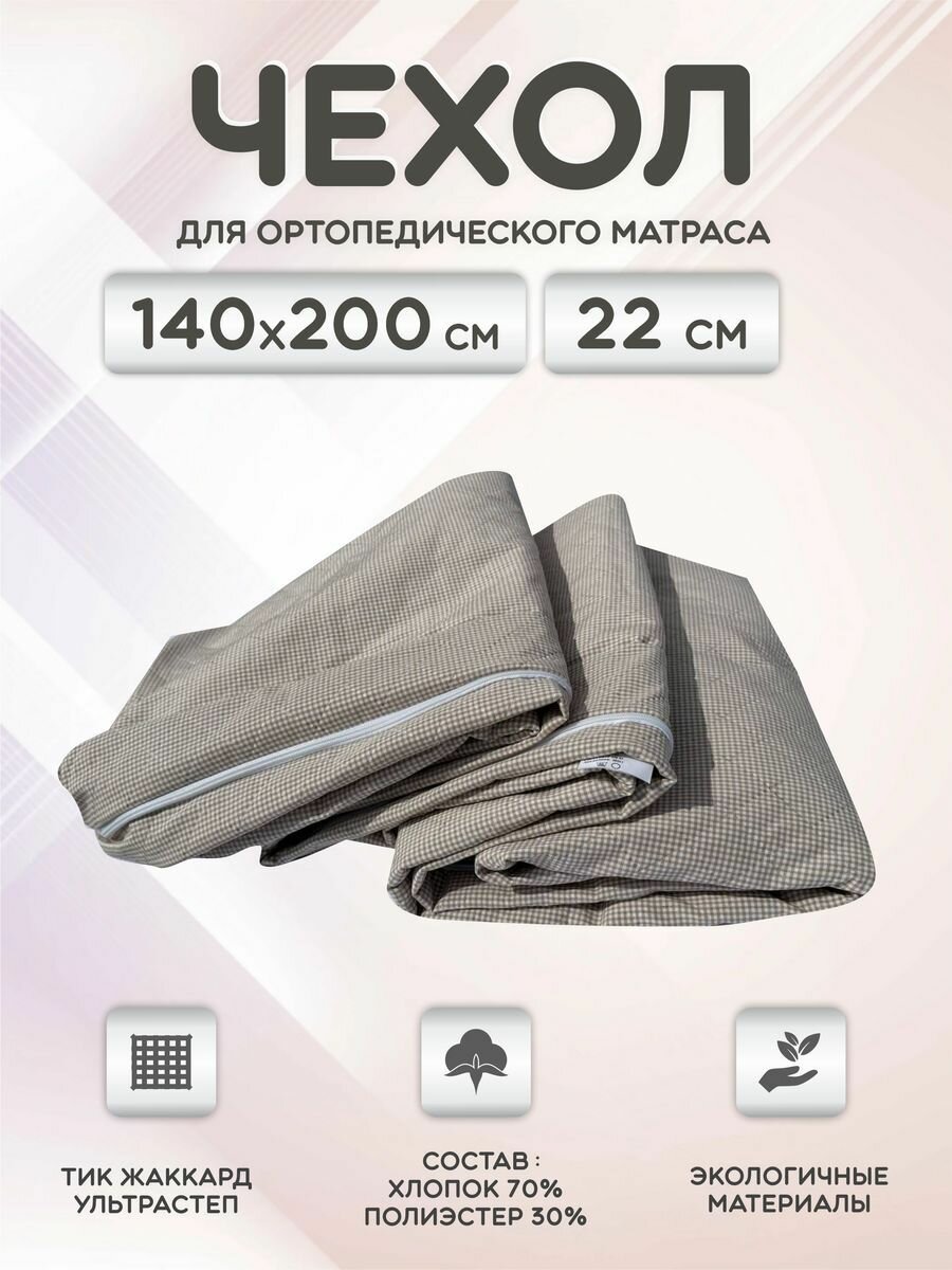 Чехол-наматрасник на ортопедический матрас Гарантия Уюта защитный, тик, на молнии, высота 22 см, 140х200 см