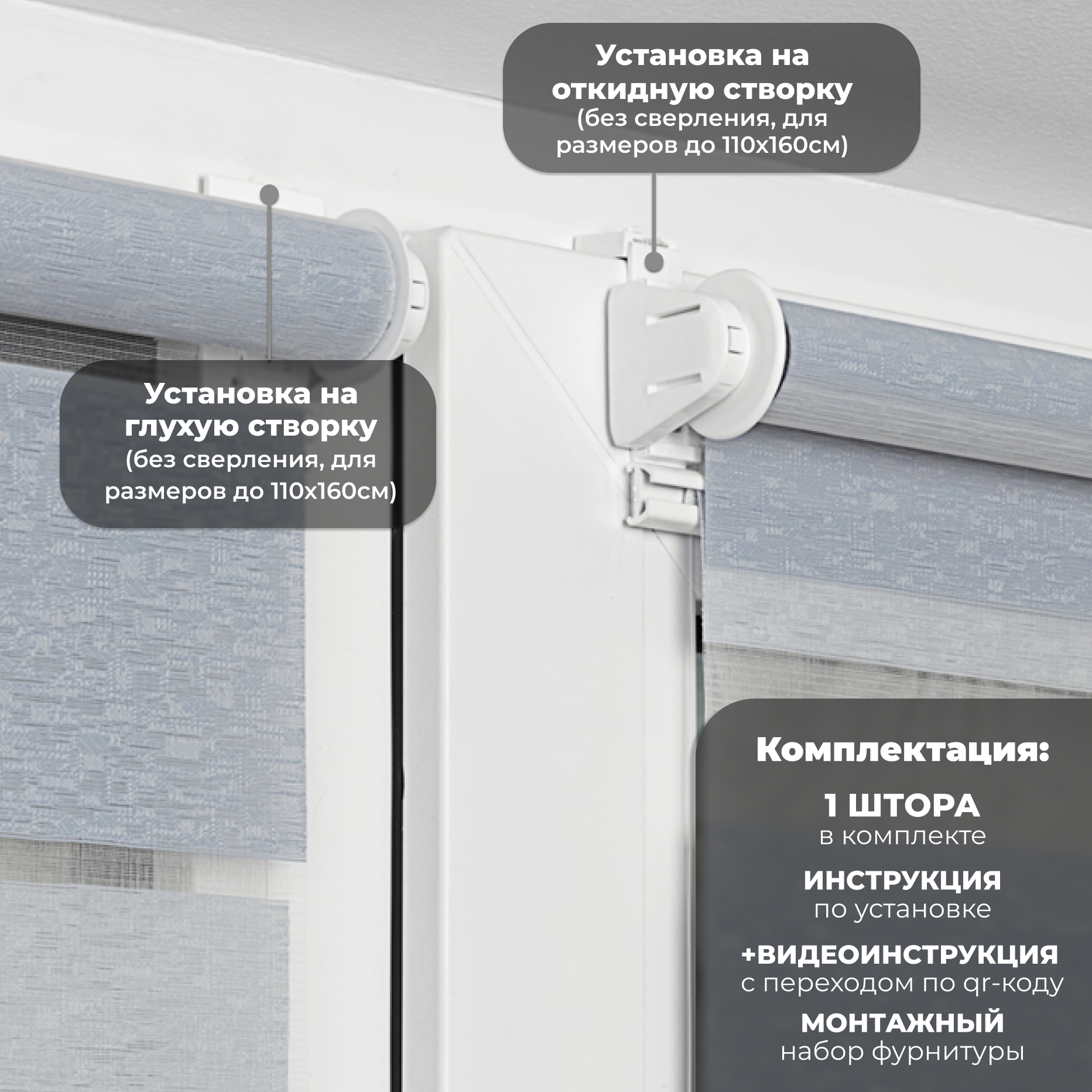 | Дополнительная информация | Несколько вариантов установки: без сверления на пластиковое глухое окно или с поворотно-откидным механизмом; со сверлением - на любое окно, на неподвижную раму, на стену (оконный проем), на раму, к потолку, в проем. |