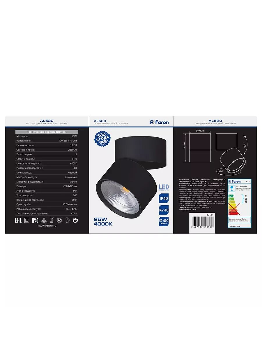 Светодиодный светильник Feron AL520 накладной 15W 4000K черный, 32462