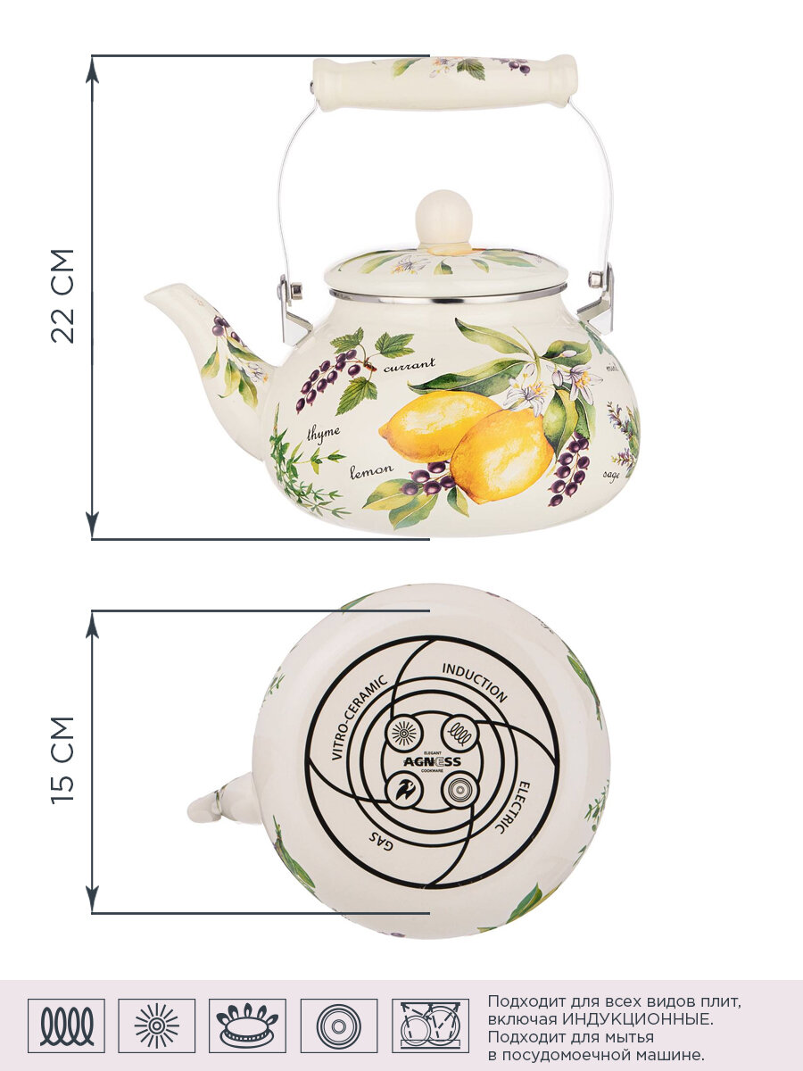 Чайник agness эмалированный со свистком серия "Фруктовая корзина", 2,2л, индукционное дно