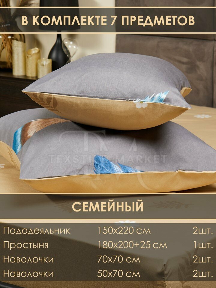 СохранитьКомплект постельного белья Сатин-люкс Семейный, пододеяльник (на молнии) 150х220 см.-2шт. Простыня (на резинке по кругу) 180х200(+25) см.-1шт. Наволочки (без ушек) 50х70 см.-2шт. Наволочки (без ушек) 70х70 см.-2шт. серый, бежевый интересное: