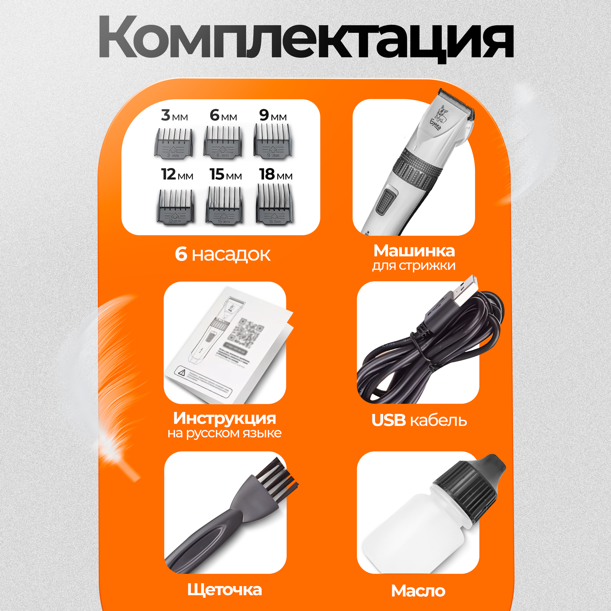 | Комплектация | Машинка для стрижки, 6 насадок, зарядный провод, масло для смазки ножей, щеточка для очистки, подарочная коробка |