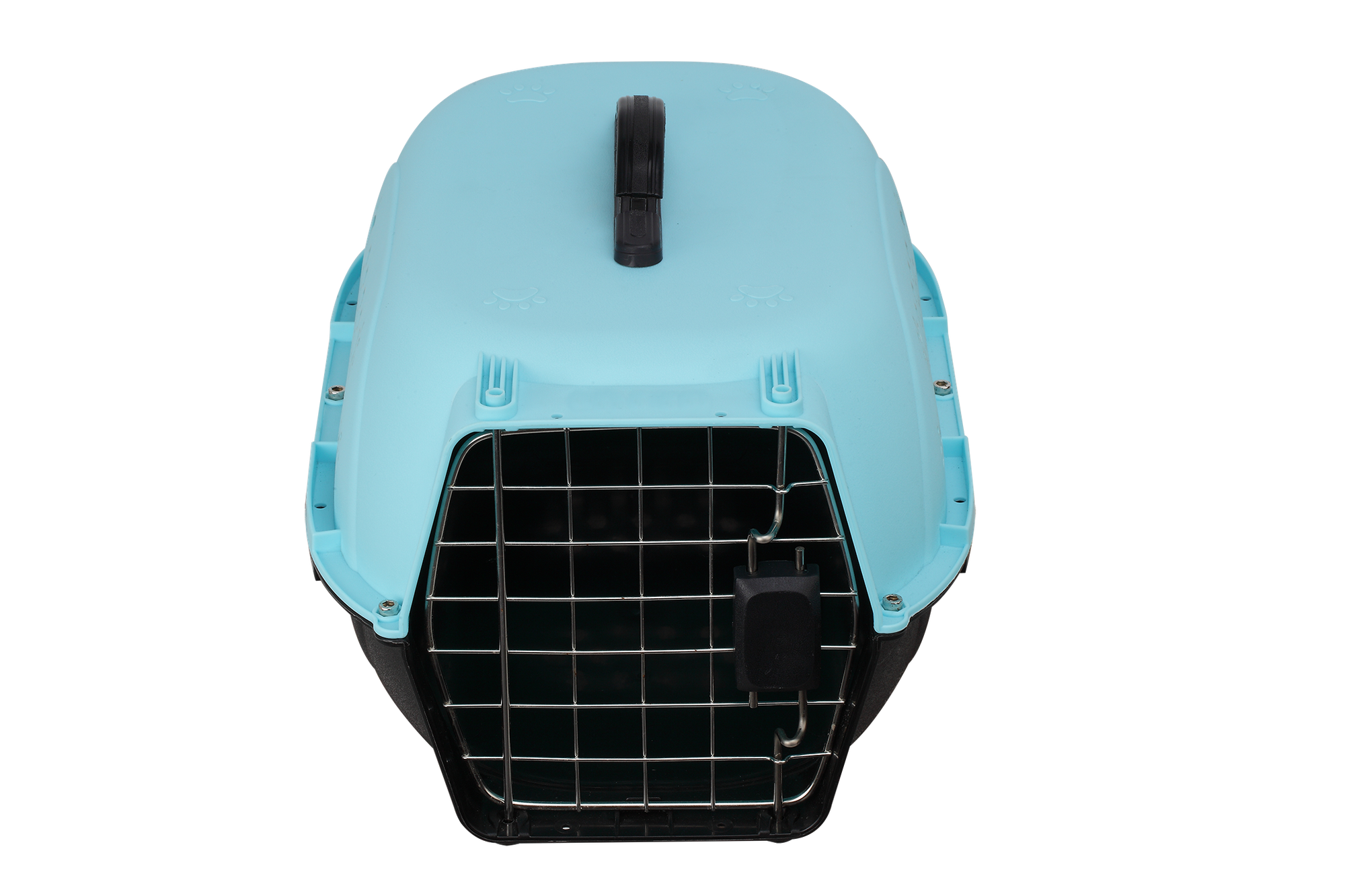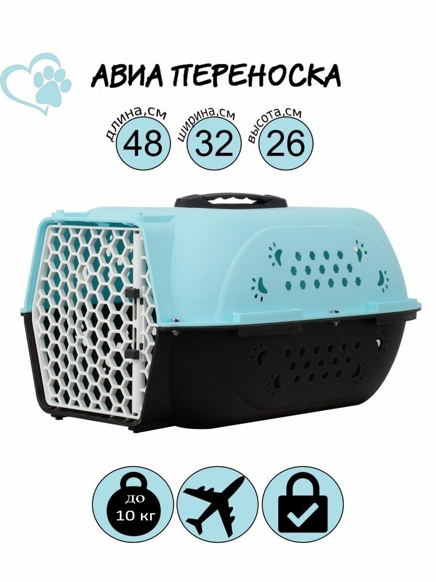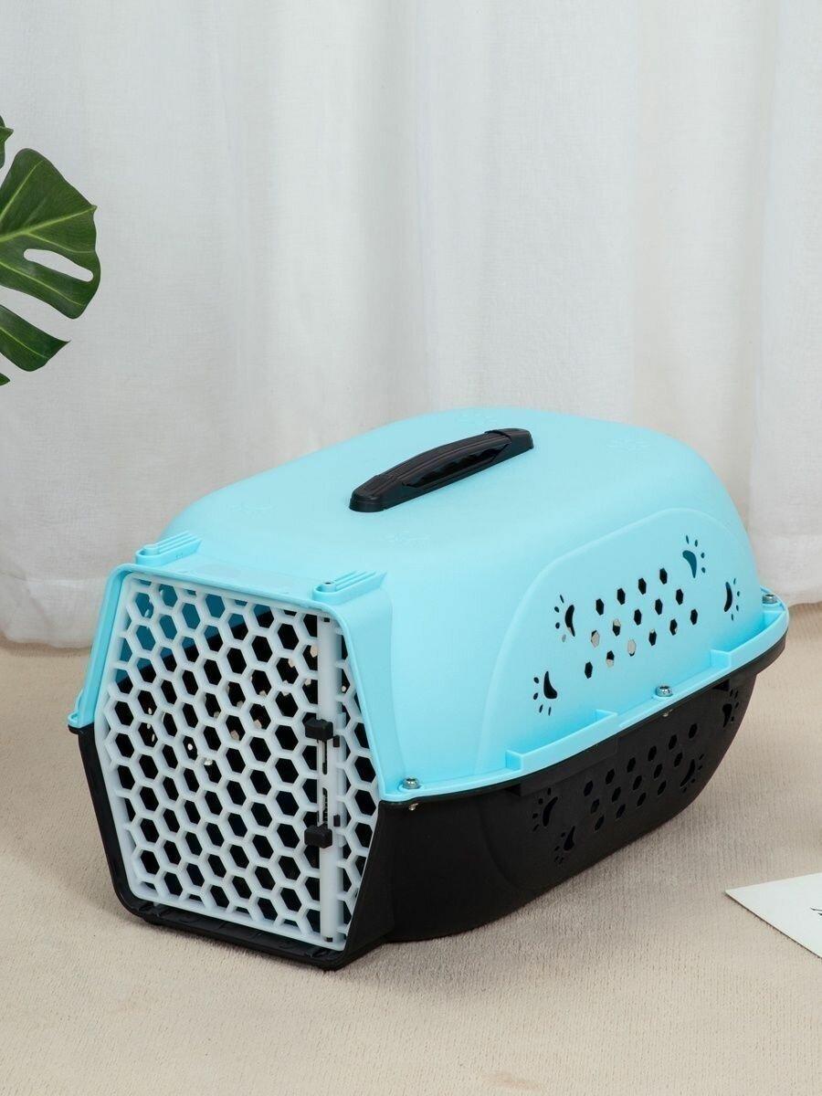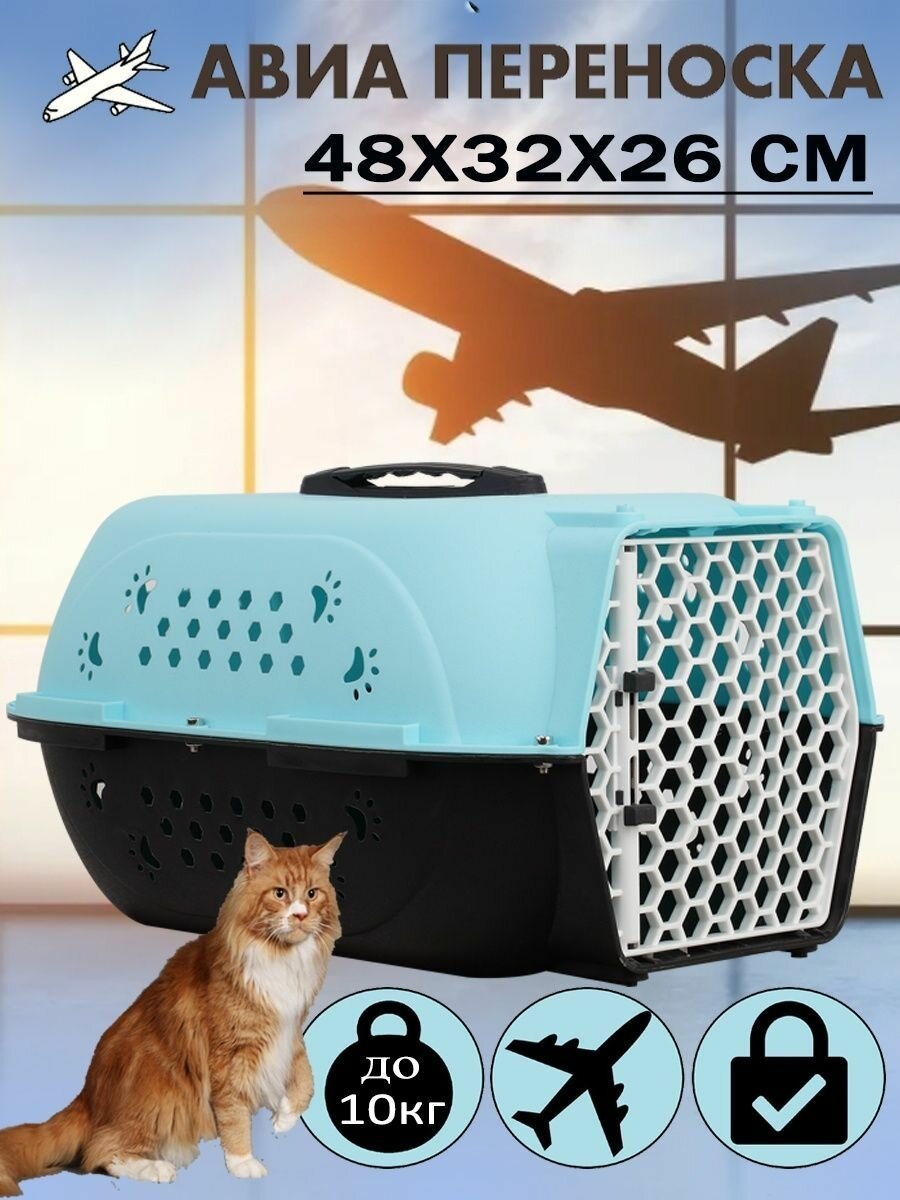 Переноска для питомцев Чистый котик для авиаперевозок, голубая, с пластиковой дверкой, 48х32х26 см