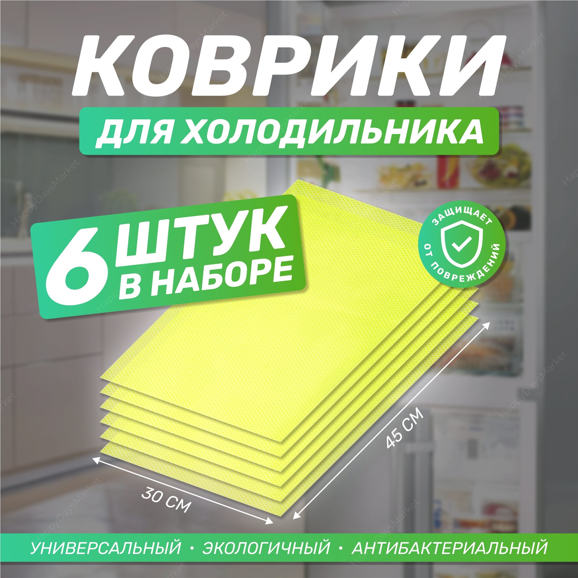 Коврики силиконовые защитные для кухонных полок, ящиков, холодильника. Антибактериальные. 6шт. Салатовые полупрозрачные.