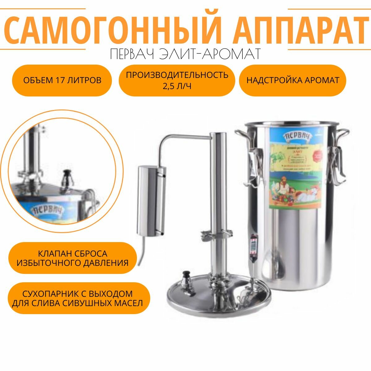 Дистиллятор первач (Самогонный аппарат) Элит Аромат 17Т 17л, нержавеющая сталь, проточный с сухопарником, термометр, клапан давления