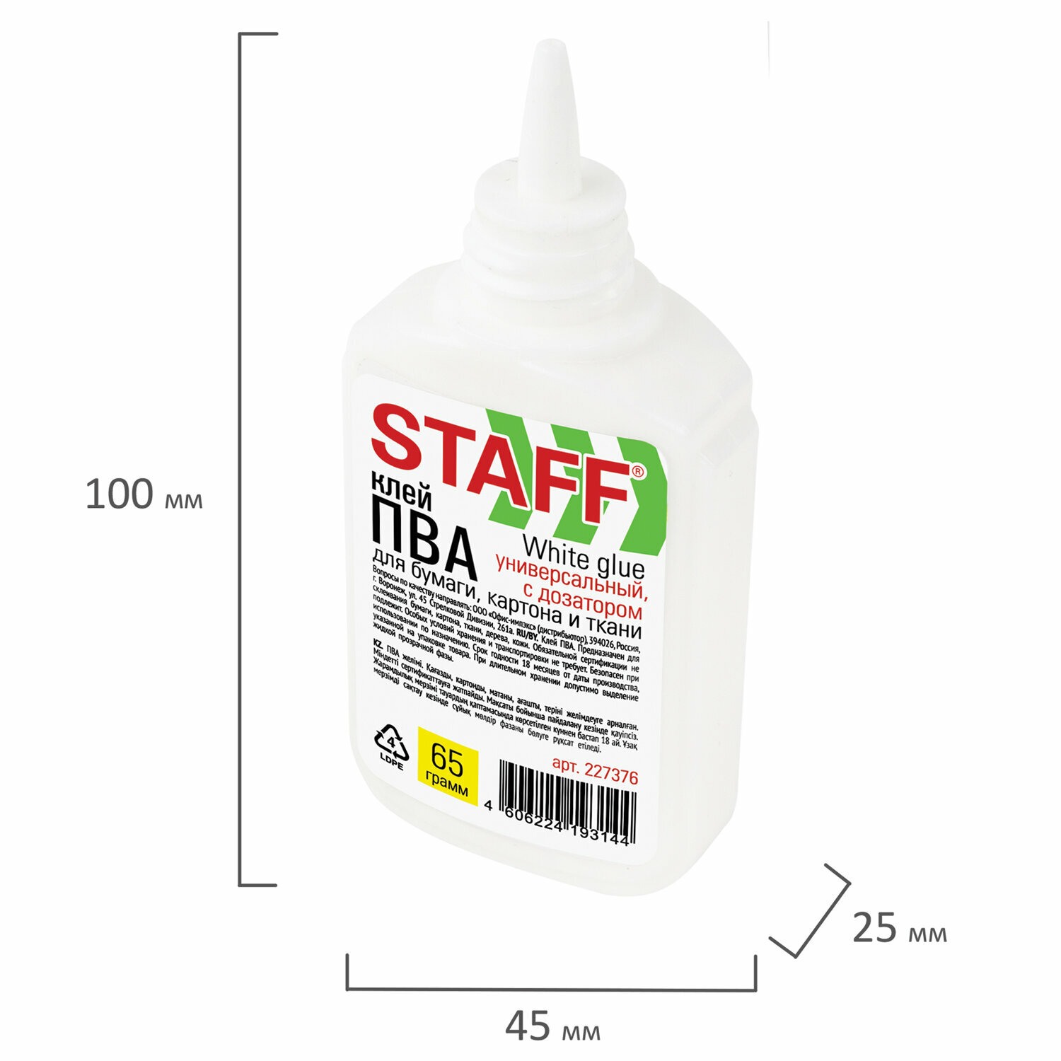 Клей ПВА с дозатором, 65 г, STAFF "Basic", 227376