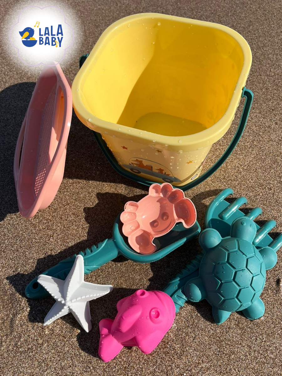 Набор для песочницы, 8 предметов, совочек, грабельки, сито, ведерко, 4 мягкие формочки, Lalababy