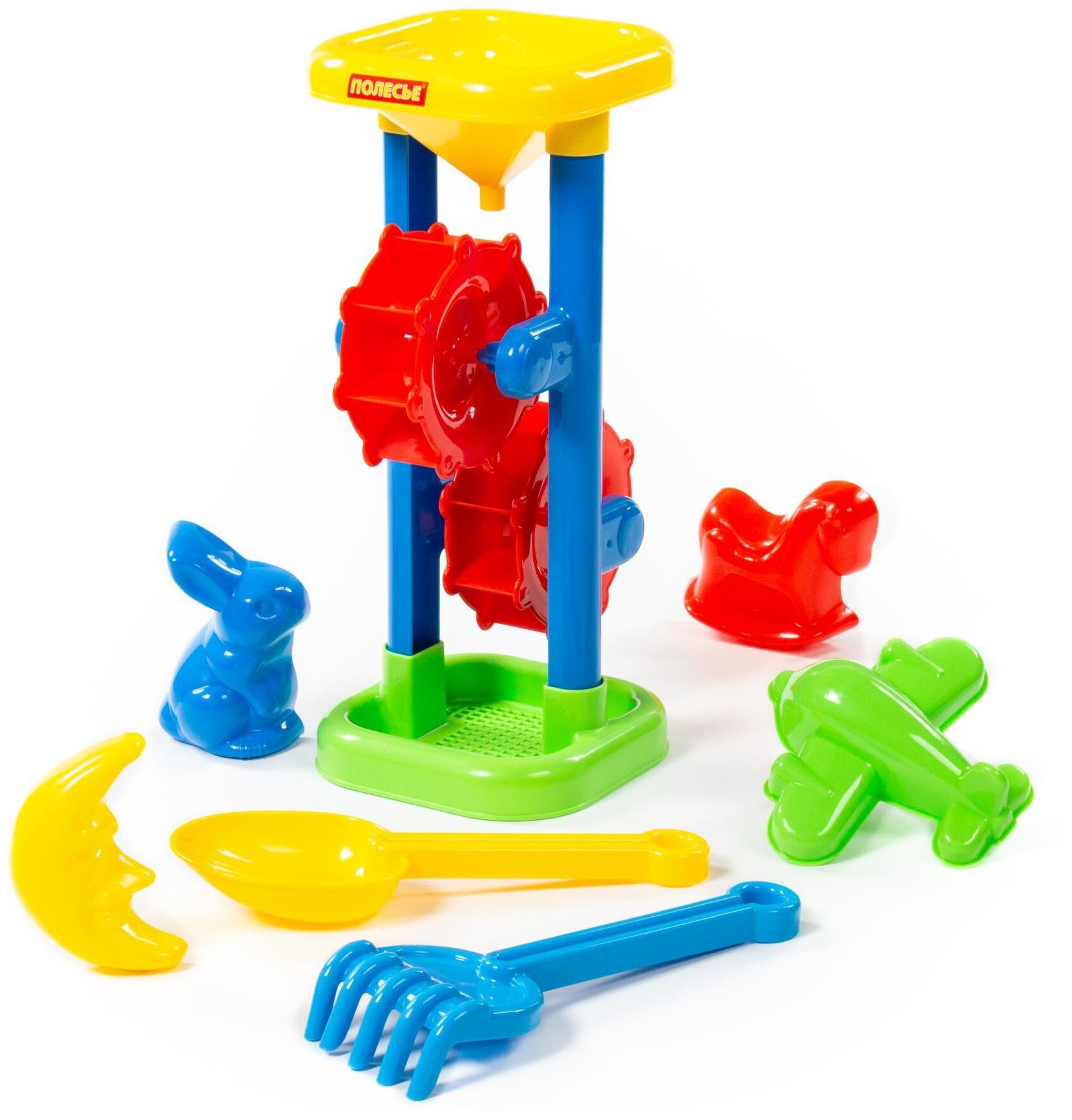 Набор №282: песочная мельница, h=308 мм + формочки (заяц + лошадка + месяц + самолёт), совок №7, грабельки №7, 18х13х30,8 см. П-35103-no