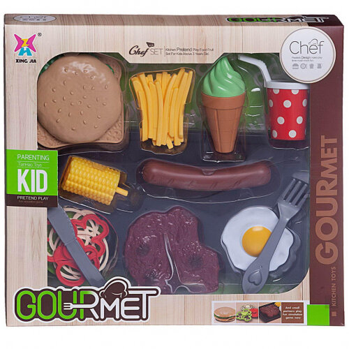 | Комплектация | тарелка, стейк, картошка фри, яичница, овощи нарезка – 3 шт., бургер – 5 шт., сосиска, кукуруза, мороженное, стакан, вилка, нож. |