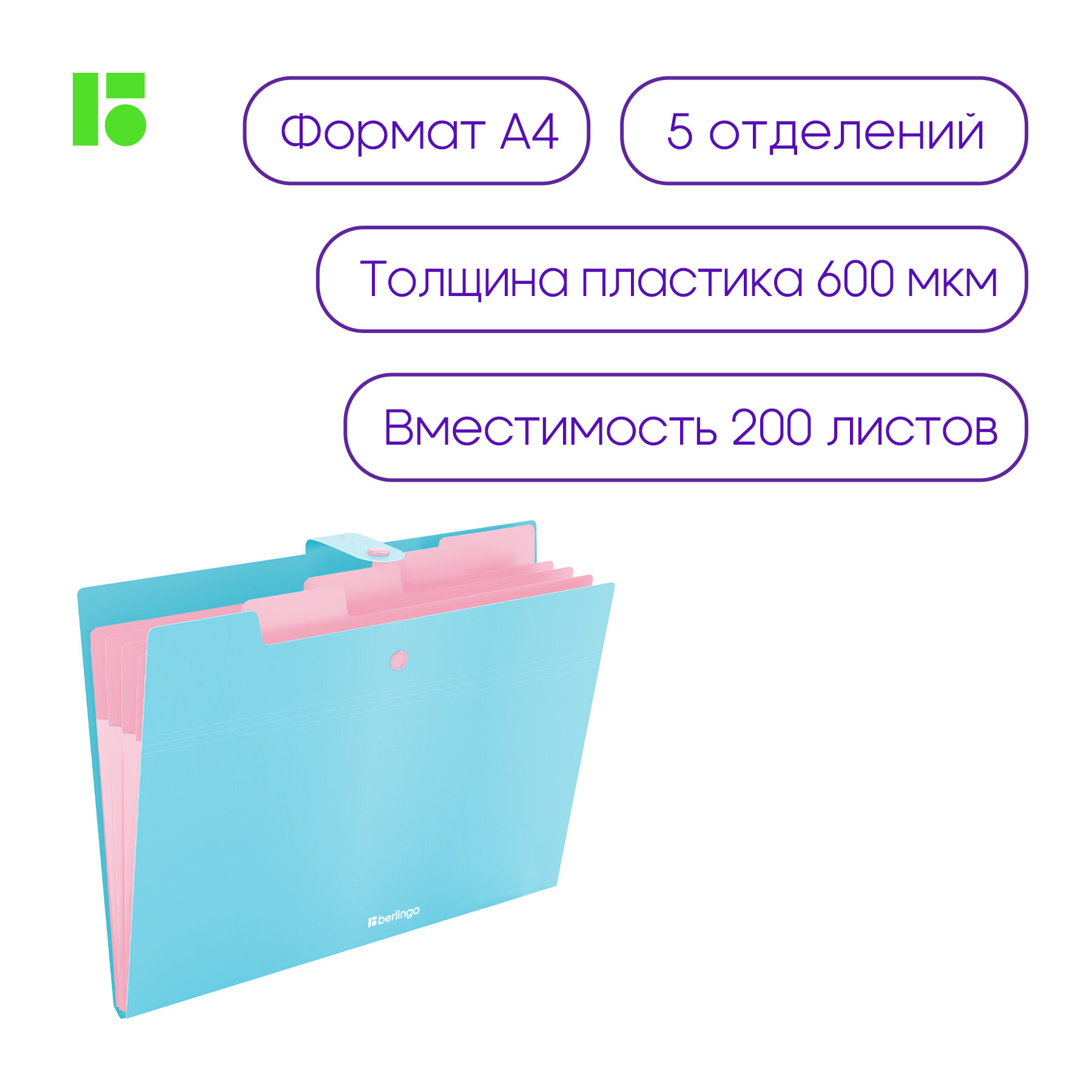 Папка 5 отделений Berlingo "Haze", А4, 600мкм, на кнопке, мятная