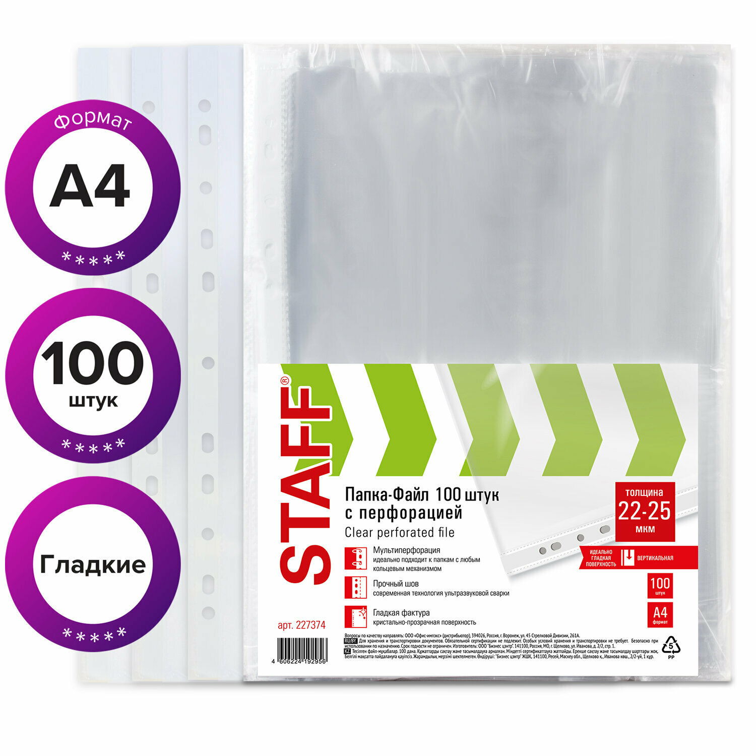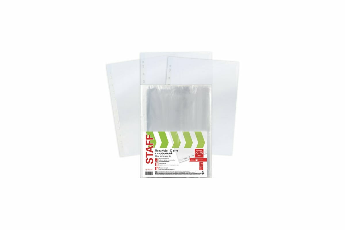 Купить Папки-файлы перфорированные эконом, А4, STAFF, комплект 100 шт., гладкие, 22 - 25 мкм, 227374