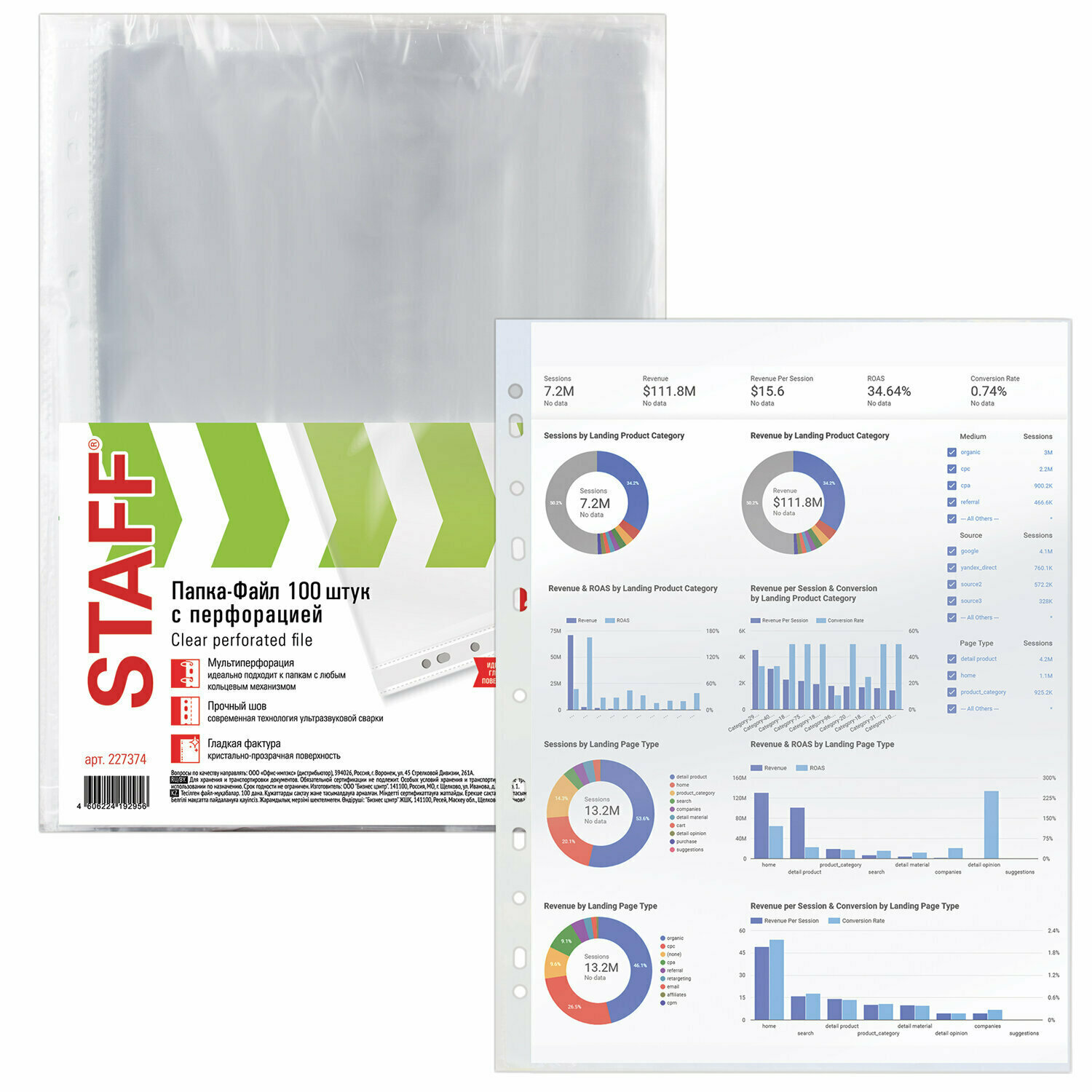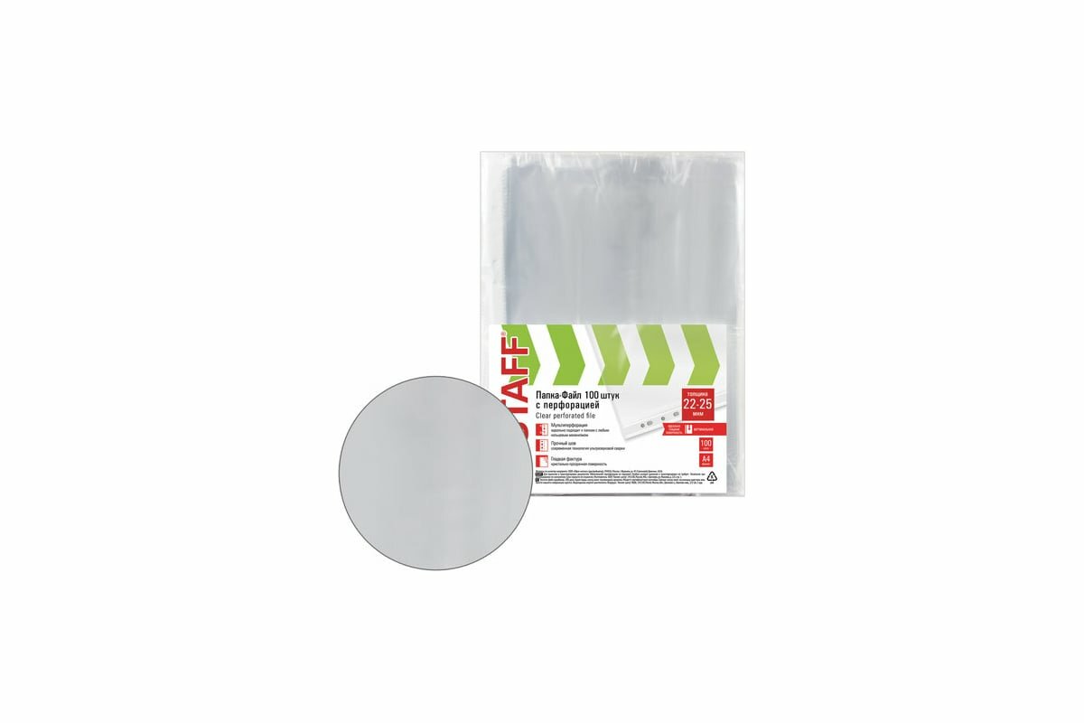 Папка-файл/вкладыш/мультифора с перфорацией формата А4 канцелярские для документов/бумаг, гладкие, комплект из 100 шт., 22-25 мкм, Staff