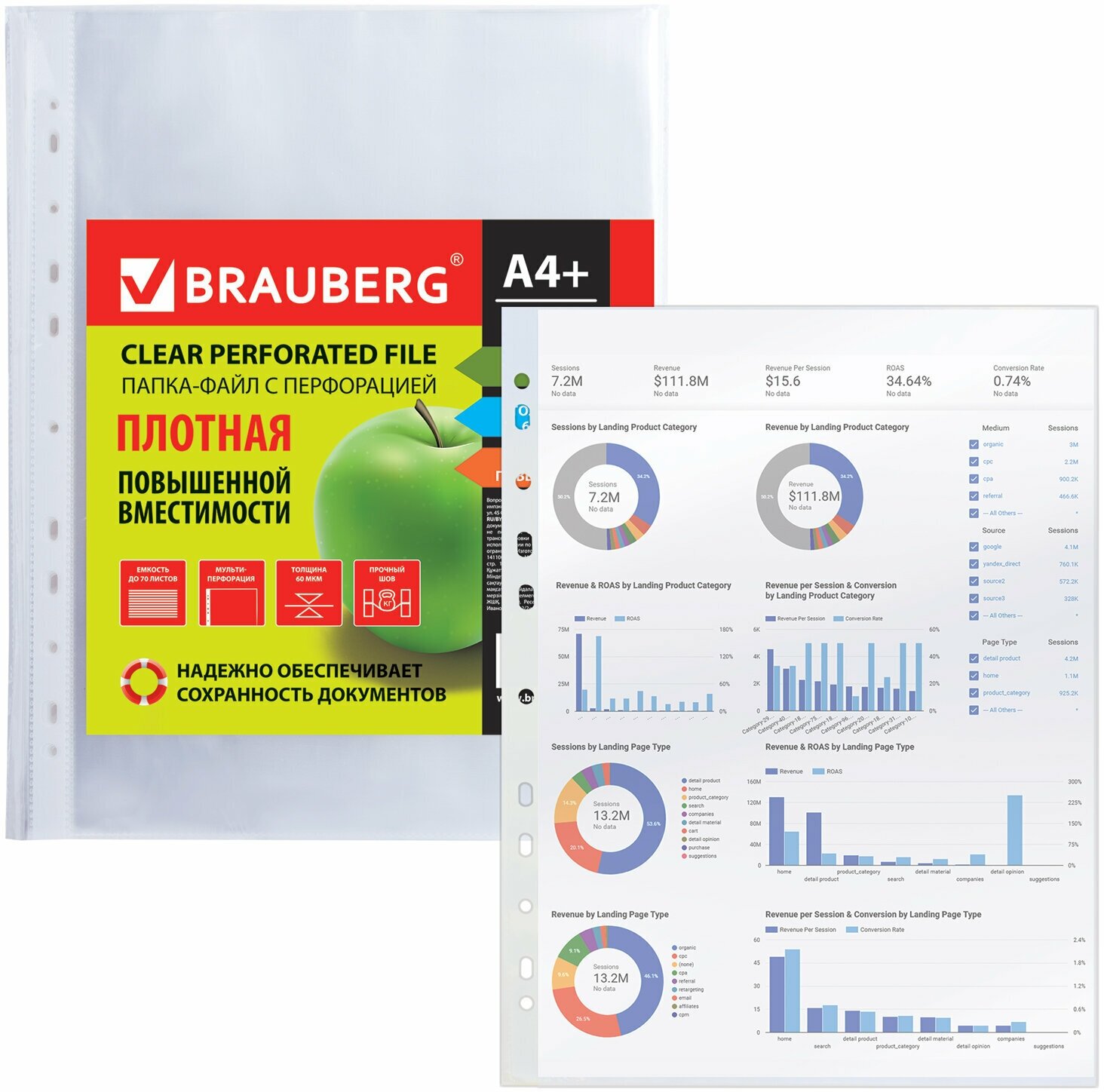 Купить Файл мультифора с перфорацией формата А4+ канцелярские для документов/бумаг, гладкие, 50 штук, сверхпрочные, 110 мкм, Brauberg, 222159