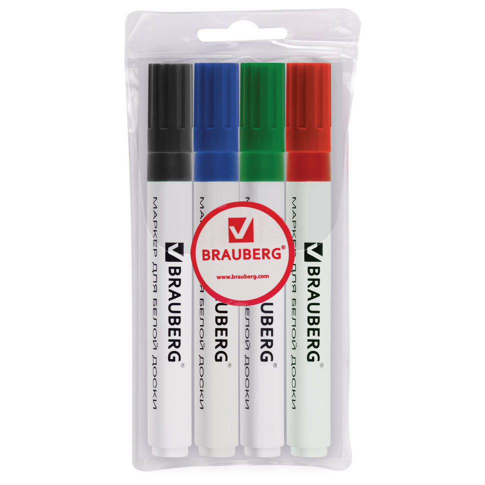Маркеры/фломастеры для магнитной доски стирающиеся Brauberg, набор из 4 шт., 5 мм, классические, ассорти, круглый наконечник