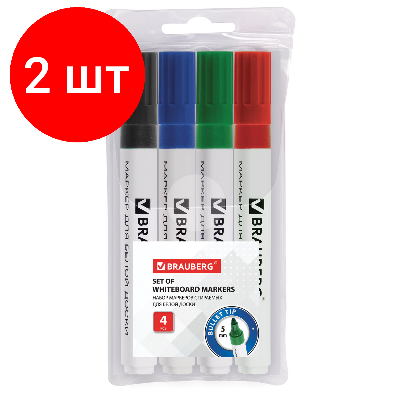 Комплект 2 шт, Маркеры стираемые для белой доски набор 4 цвета, BRAUBERG, 5 мм, 150417