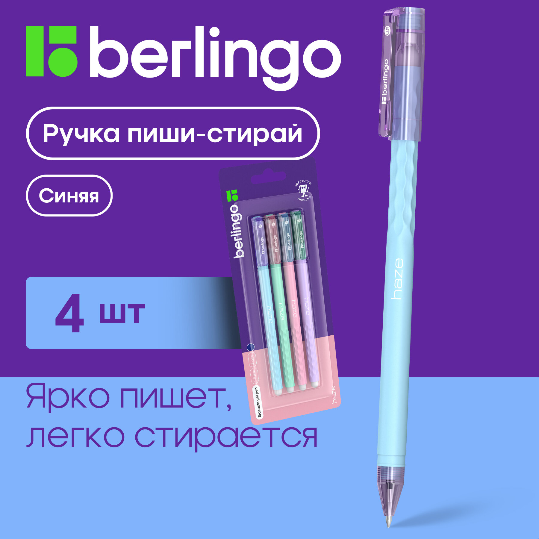 Купить Ручки гелевые синие Berlingo Haze стираемые термоисчезающие, линия 0,35 мм, набор 4 шт