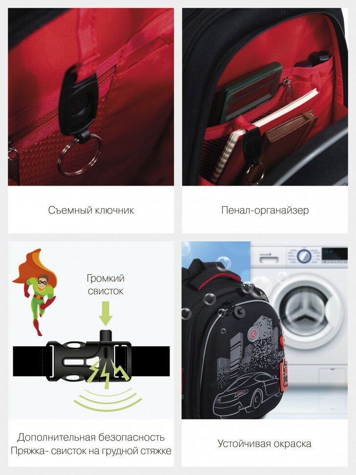 | Особенности | вентилируемая спинка / вентилируемые лямки / водоотталкивающая пропитка / жесткое дно / ножки / ортопедический / разделитель в главном отделении / регулируемые лямки / светоотражающие элементы |