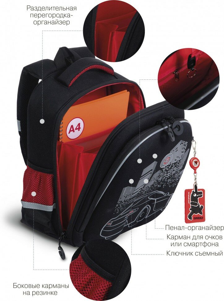 Ранец GRIZZLY анатомическая спинка, c бейджем, для мальчиков, NIGHT RACE, 36х28х20 см, RAz-287-8/1