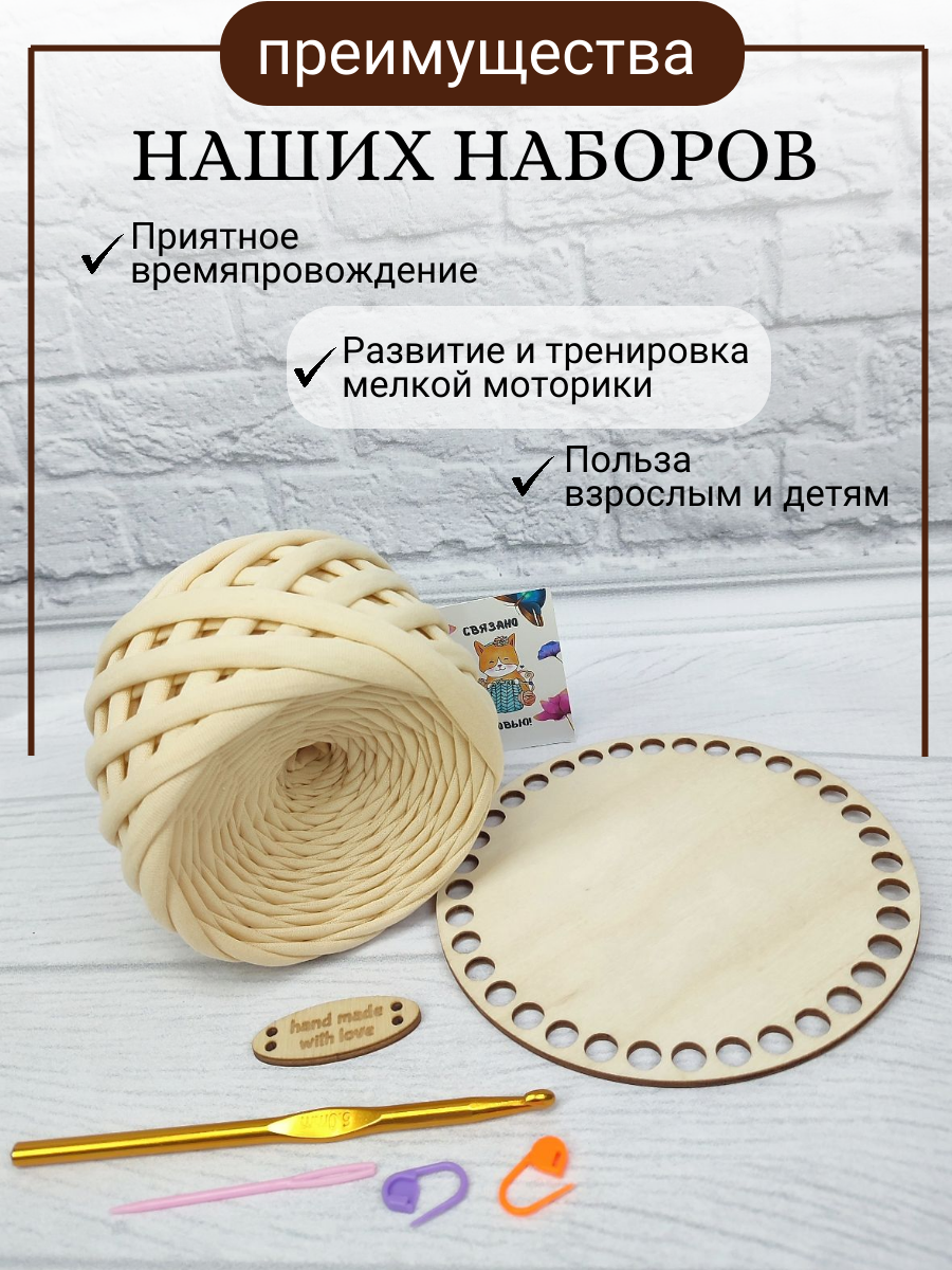 | Подробная комплектация | трикотажная пряжа изнаночной нарезки 50 метров, деревянное донышко 15 см, деревянная бирочка с надписью hand , металлический крючок №6, игла для сшивания изделий, маркировщики петель 2 шт, инструкция |
