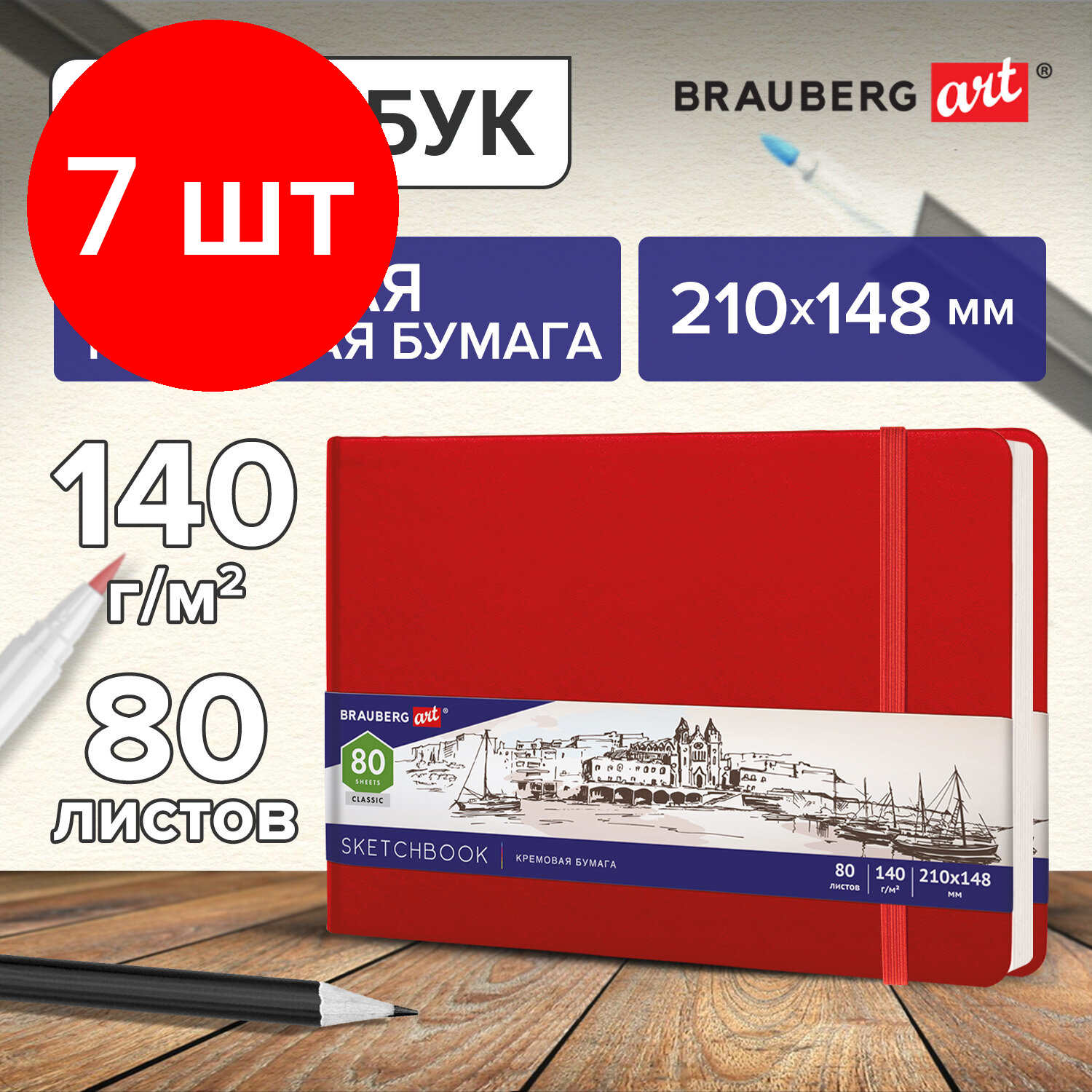 Купить Комплект 7 шт, Скетчбук, слоновая кость 140 г/м2 210х148 мм, 80 л., кожзам, резинка, BRAUBERG ART CLASSIC, красный, 113197