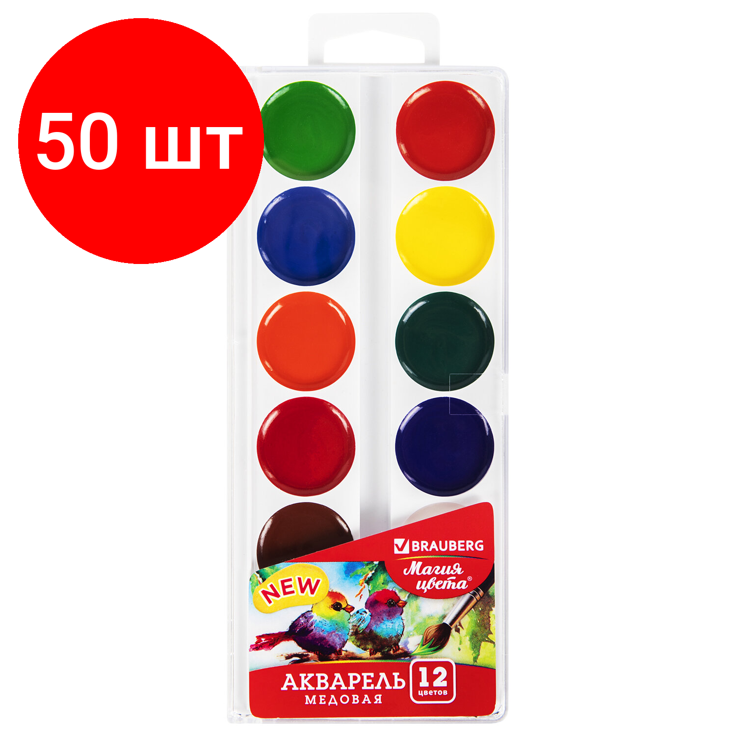 Купить Комплект 50 шт, Краски акварельные BRAUBERG "магия цвета NEW", медовые, 12 цветов, круглые кюветы, 192286