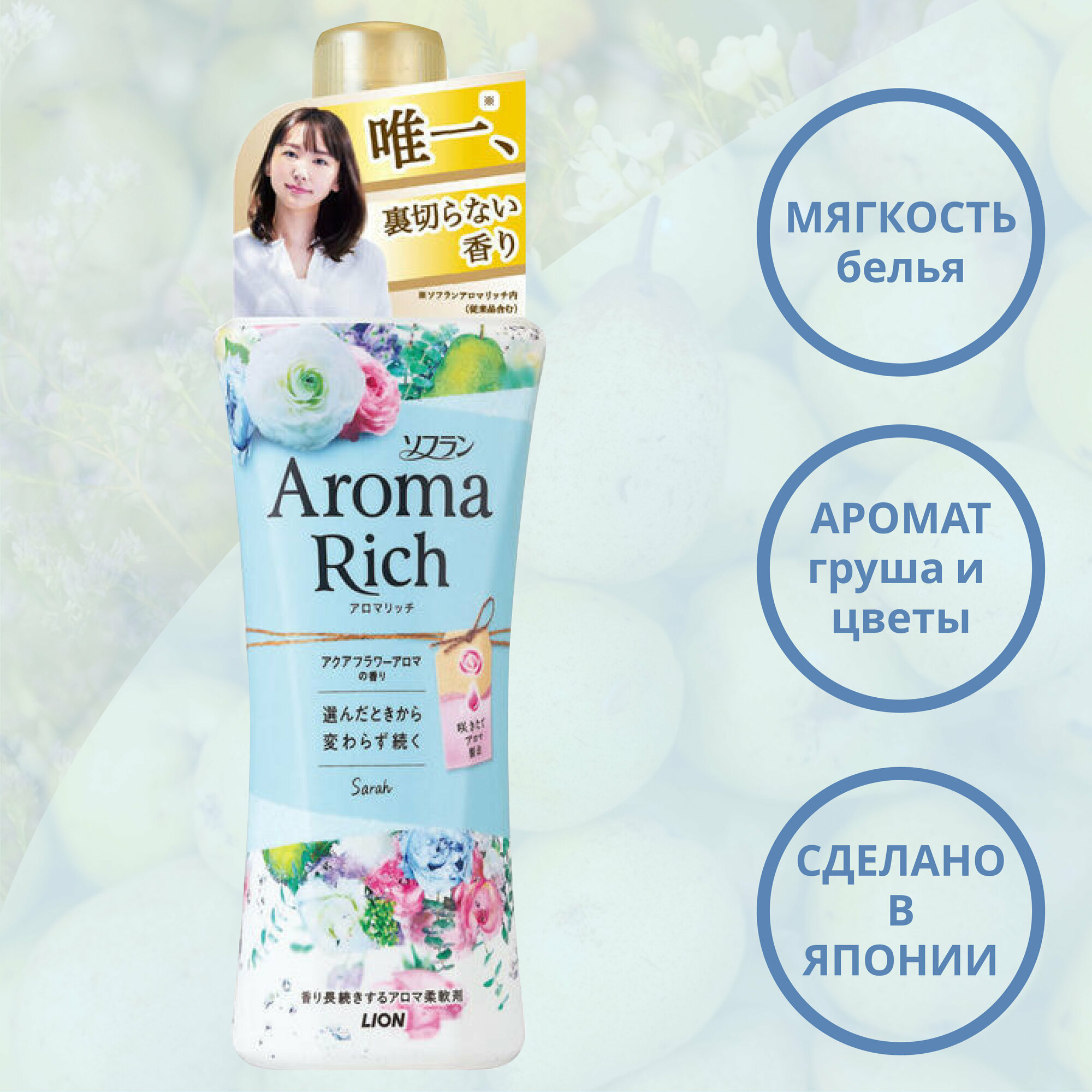 LION Кондиционер для белья Aroma Rich Sarah с ароматом груши, ландыша и водяной лилии, 520 мл