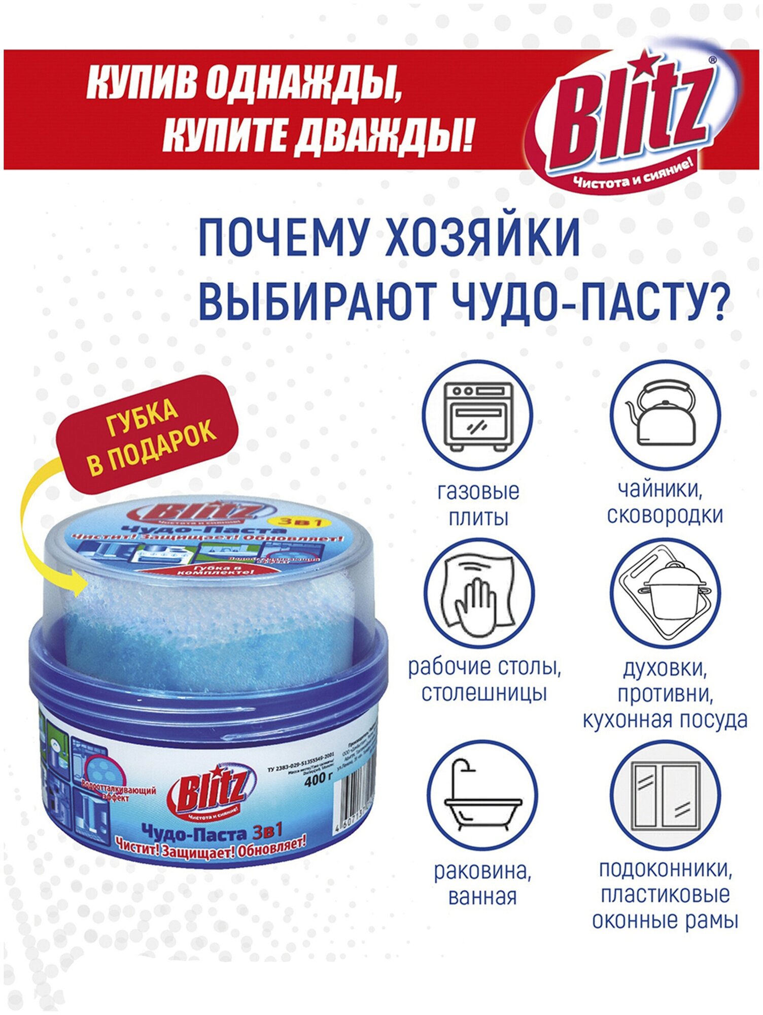 Чудо-паста Blitz 400 г с губкой, 3 в 1, средство для чистки сантехники, кафеля, чистящее средство для плиты, чистящее средство для ванной