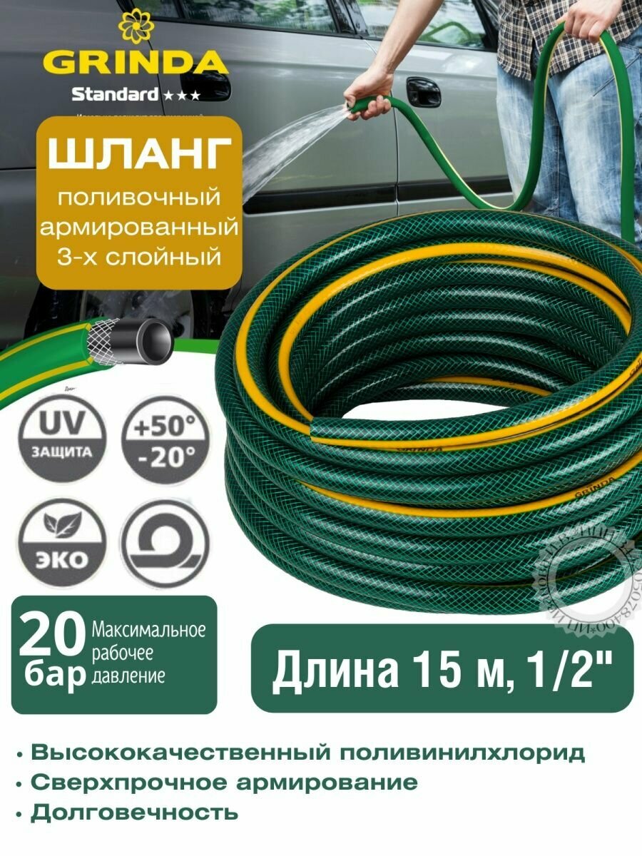 Шланг поливочный, 15 атм, армированный, 3-х слойный, 1/2"х15м, GRINDA Standard 429000-1/2-15