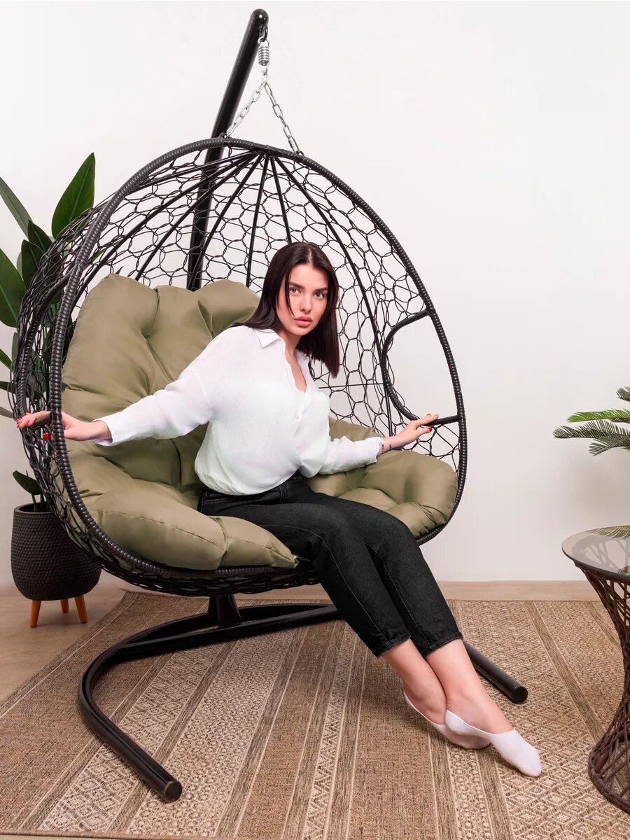 Подвесное кресло для двоих с ротангом чёрное, бежевая подушка