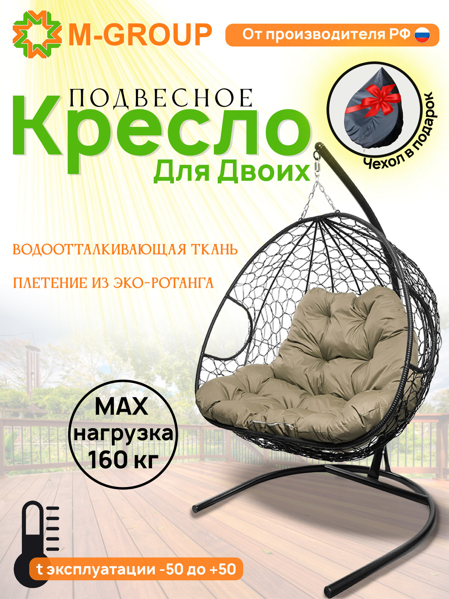 Купить Подвесное кресло кокон двухместное M-group для двоих с ротангом чёрное+бежевая подушка