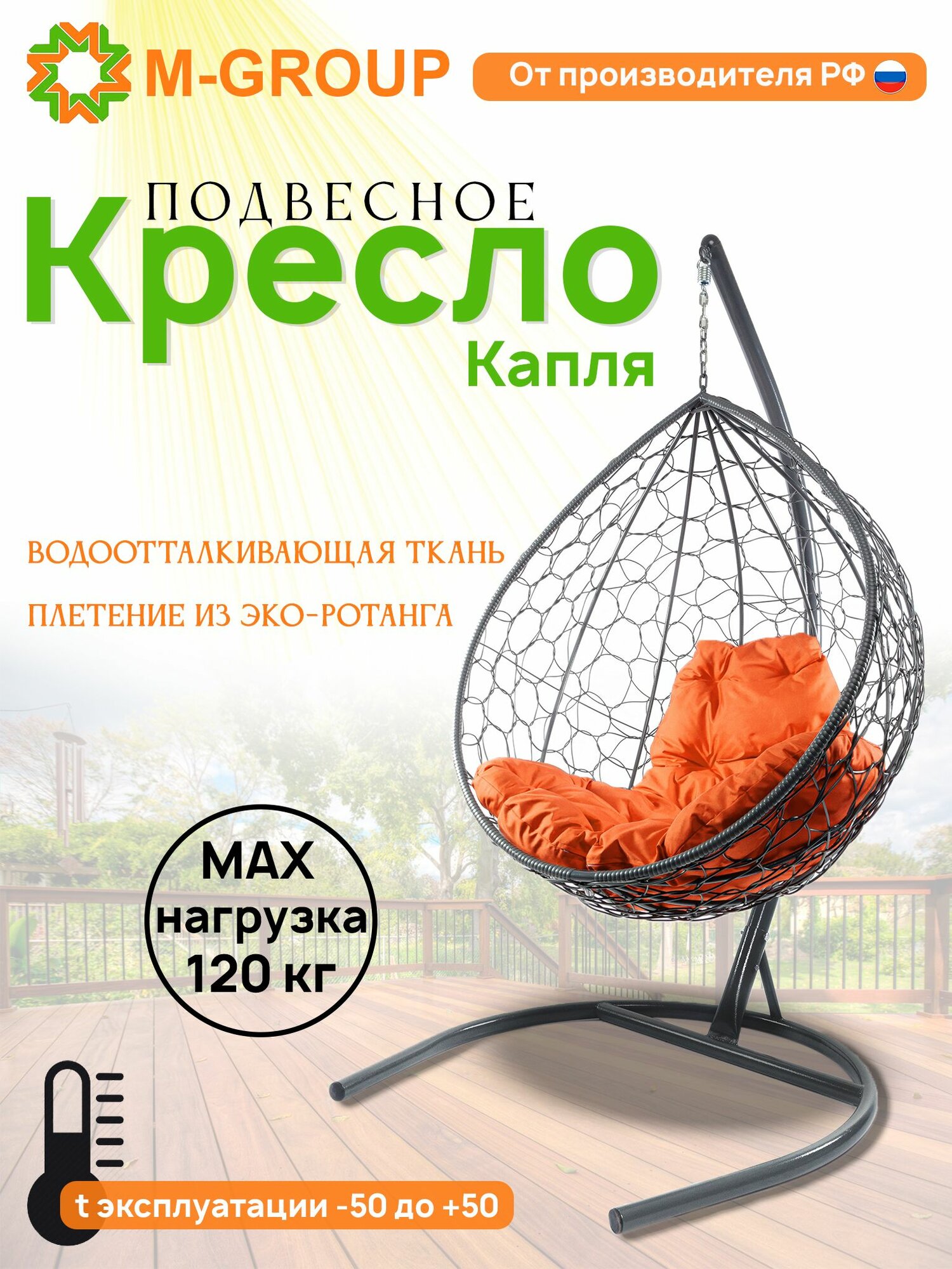 Купить Подвесное кресло M-group капля складной, с ротангом серое оранжевая подушка