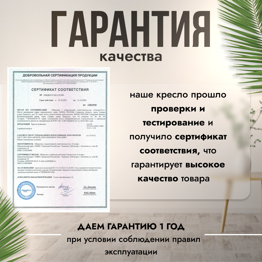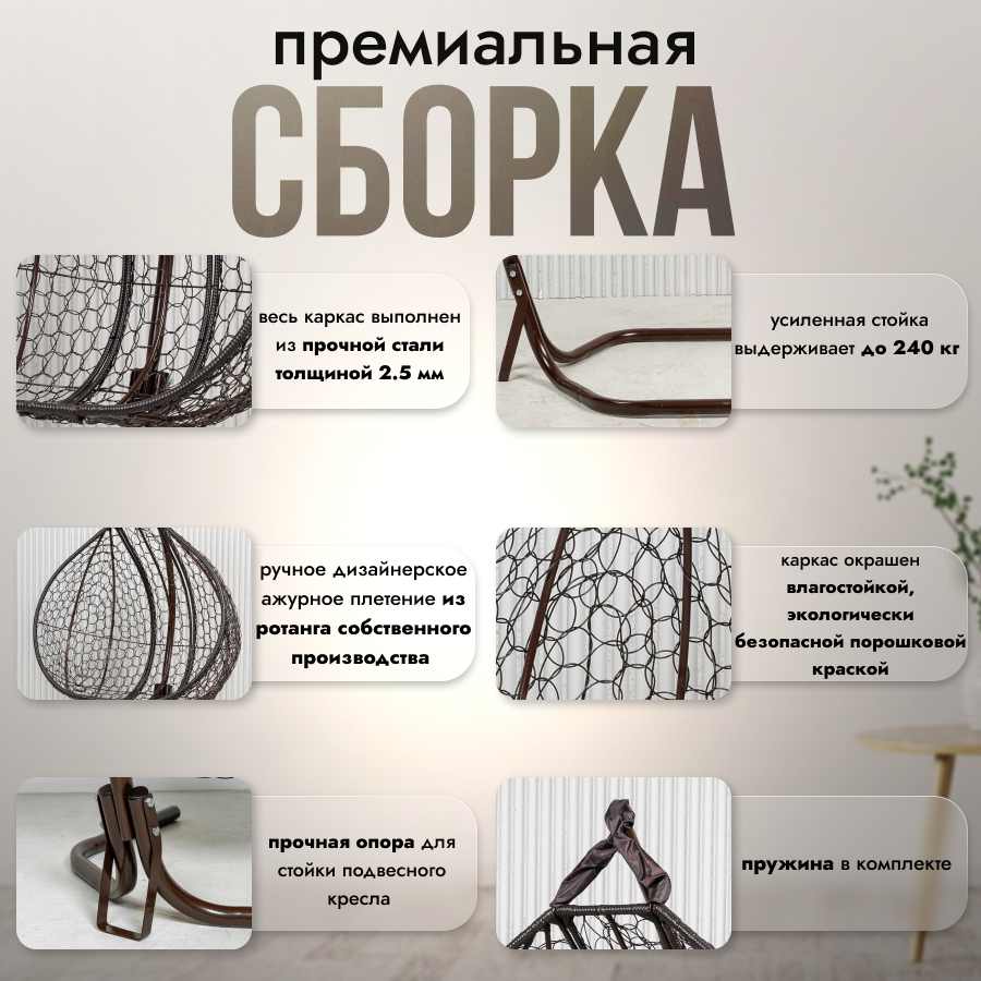 | Комплектация | В комплект входит: 1) Сборно-разборная усиленная металлическая стойка. Основание разборное в форме бабочки обеспечивает устойчивое положение. Конструкция выдерживает максимальную нагрузку до 200 кг. Высота стойки - 195 см. 2) Складной кокон с плетением Ажур. Кокон оплетается вручную собственным ротангом. Размеры кокона: Высота-116 +-3 см, Ширина -138 +-3см, Глубина - 64 +-3 см 3) Круглая подушка, плотно набитая Холлофайбером, который служит 3-4 дольше и сохранит свою форму. Материал чехла подушки - Оксфорд, влагоотталкивающая ткань. 4) Комплект креплений. |