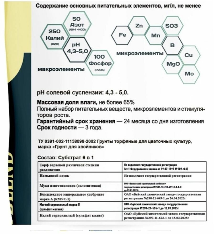 | Основные питательные вещества в мг/л, не менее | мг/л не менее: азот - 50, фосфор - 100, калий - 250, pH - 4,3-5,0 |