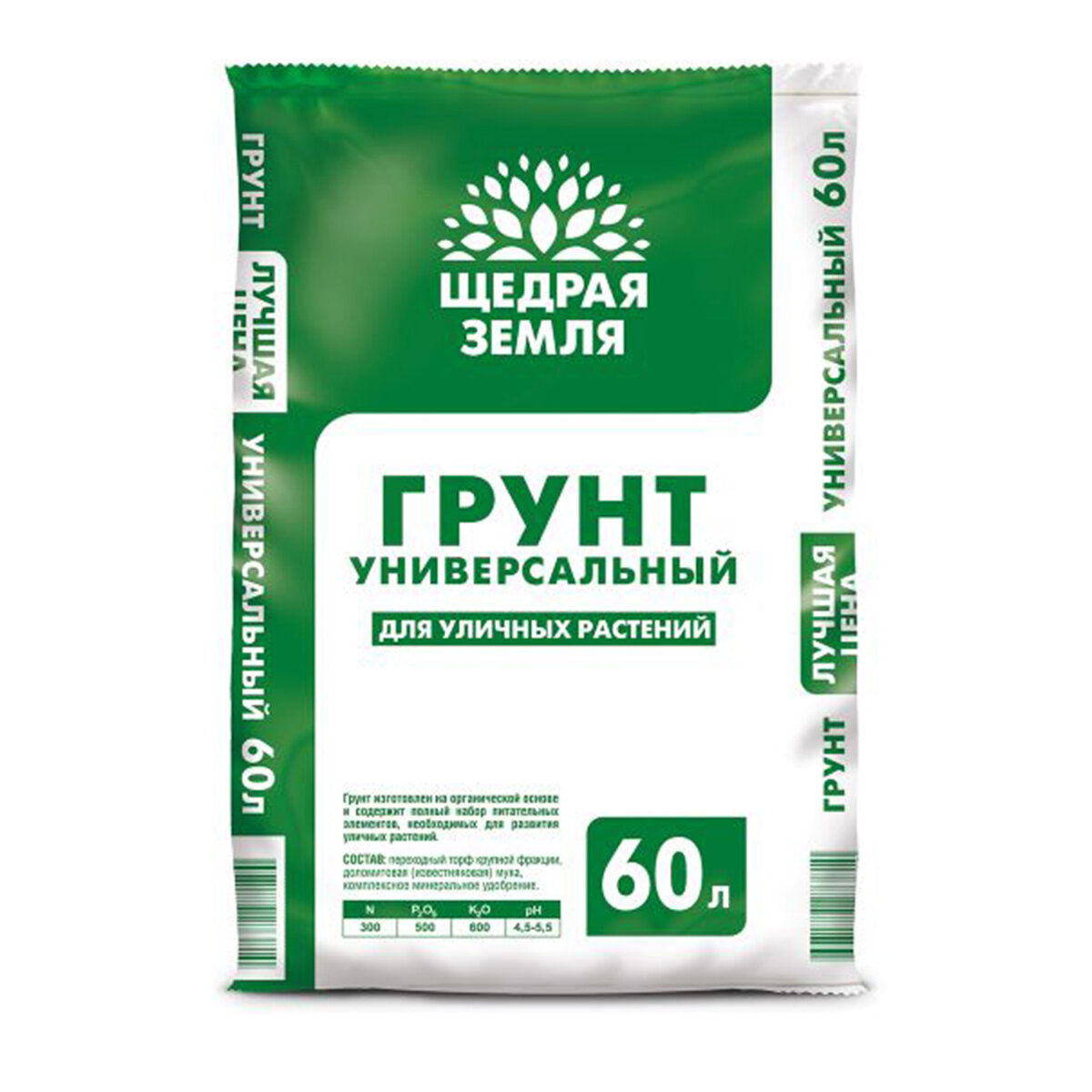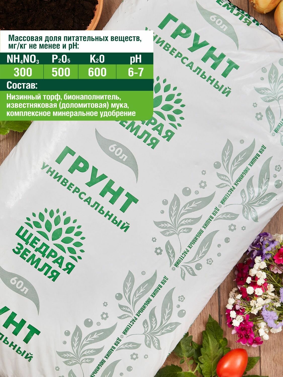| Состав | Грунт Щедрая Земля универсальный, 60 л, 20.3 кг |