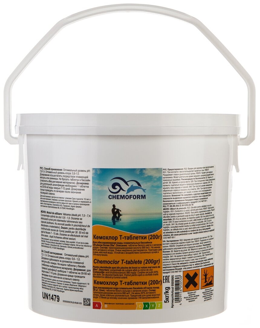 Таблетки хлора Chemoform для быстрой и продолжительной очистки воды в бассейне. медленный хлор обеспечивают антибактериальную и антигрибковую защиту 200 гр 5 кг