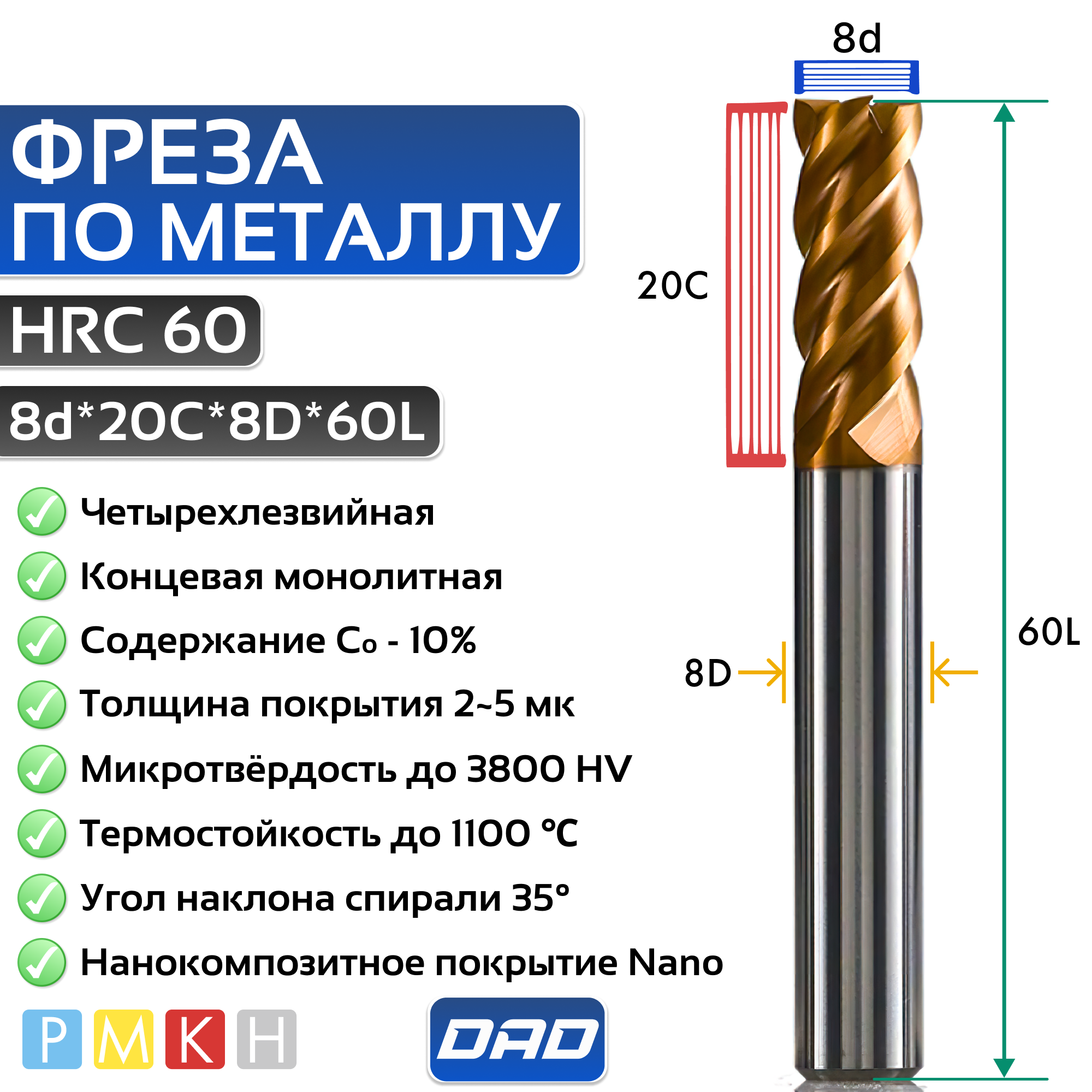 Купить Фреза по металлу концевая 8d*20C*8D*L60*4F HRC60 монолитная твердосплавная с нанокомпозитным покрытием Nano
