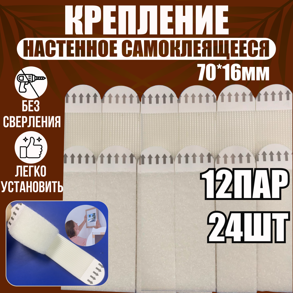 Крепление для картины без сверления 12 пар/24 шт, размер 70/16 мм, крючки на липучке, полоски самоклейки на стену, крючок для картин без сверления / выдерживают до 4 кг