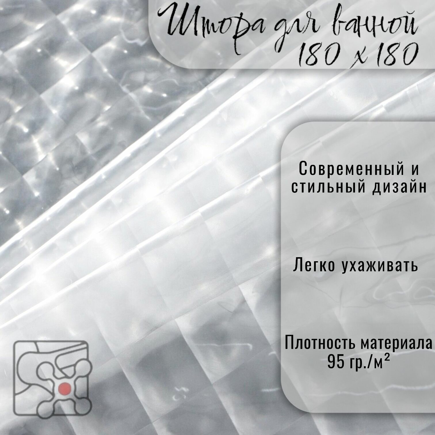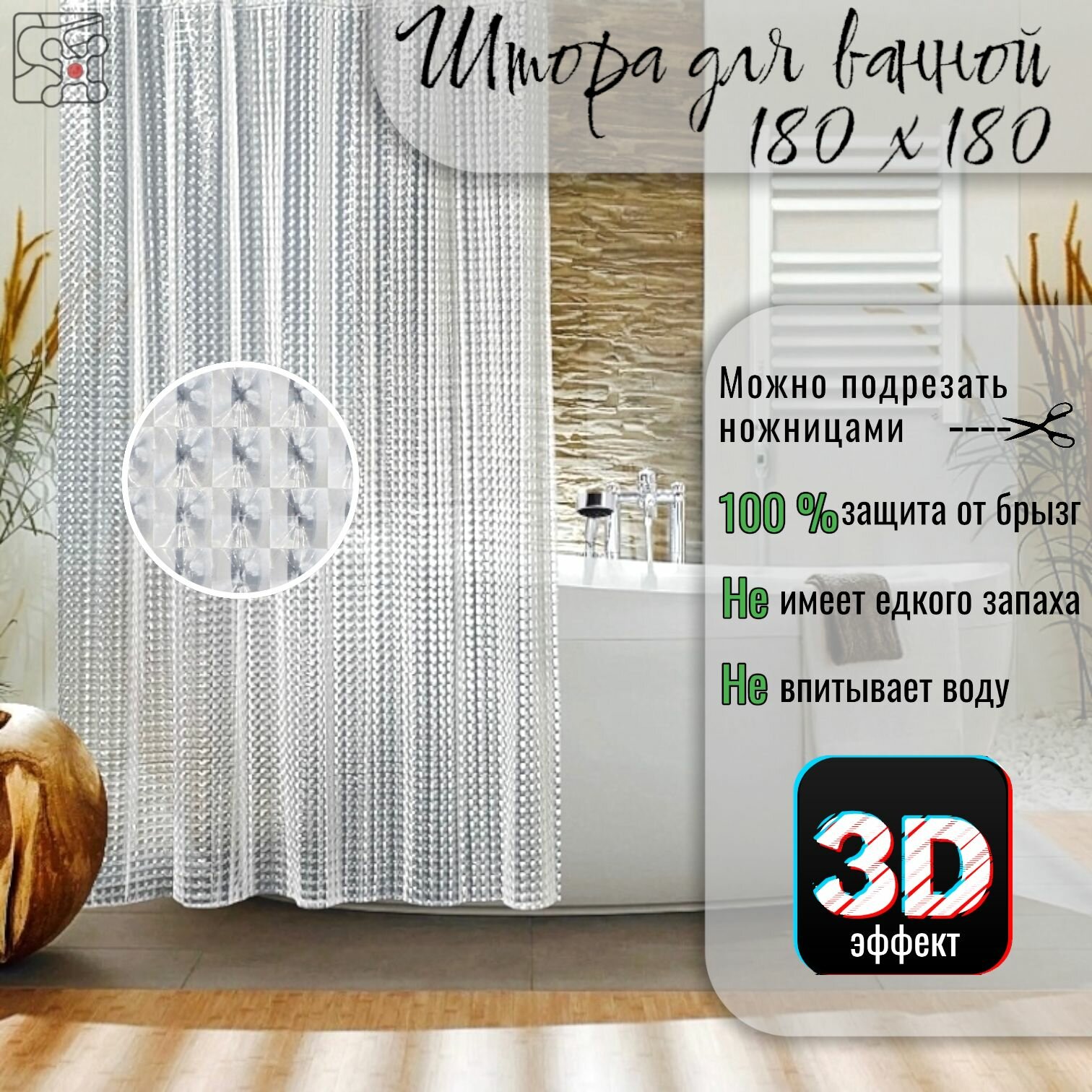 Штора для ванной комнаты 180х180 см Stt полупрозрачная с 3D-эффектом / Шторка 3Д для ванной комнаты и душа 180 см на 180 см / Кольца в комплекте интересное: