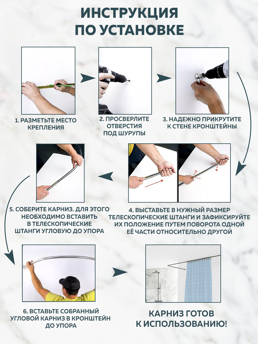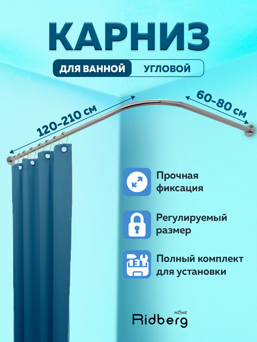 Карниз для ванной угловой телескопический раздвижной серебристый Ridberg 100-35 120-210 см/60-80 см / Штанга для душа в стену
