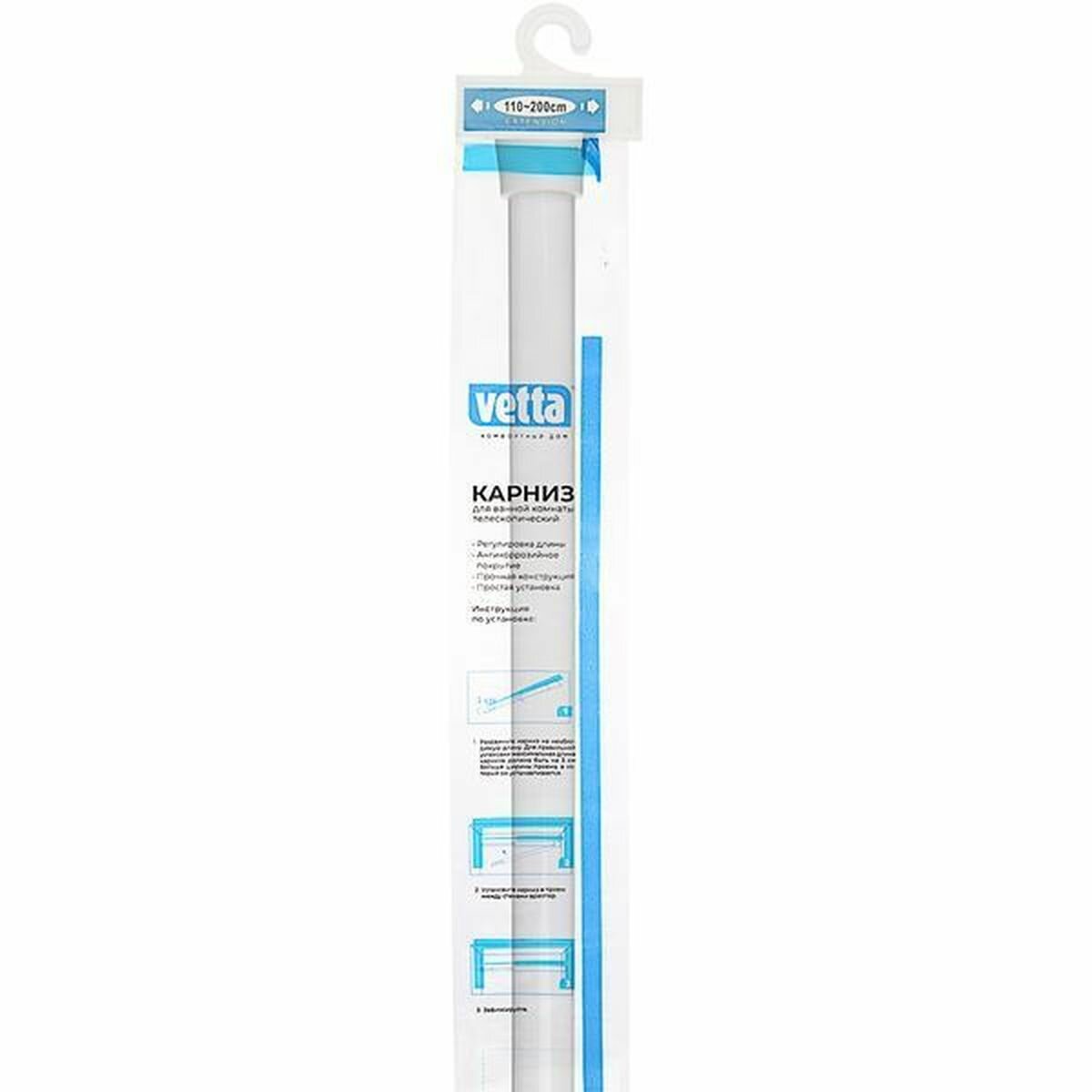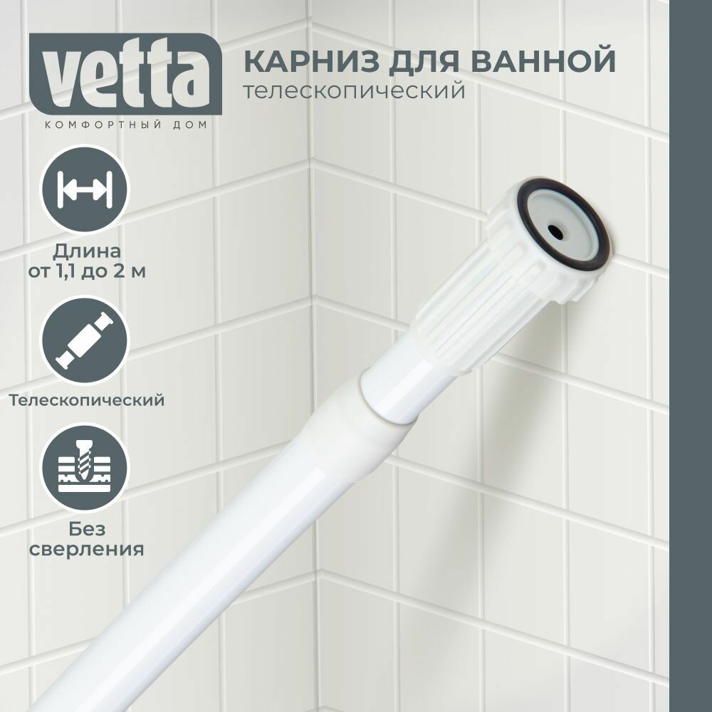 Карниз для ванной телескопический Vetta, длина 110-200 см, нагрузка до 2 кг, алюминий, белый