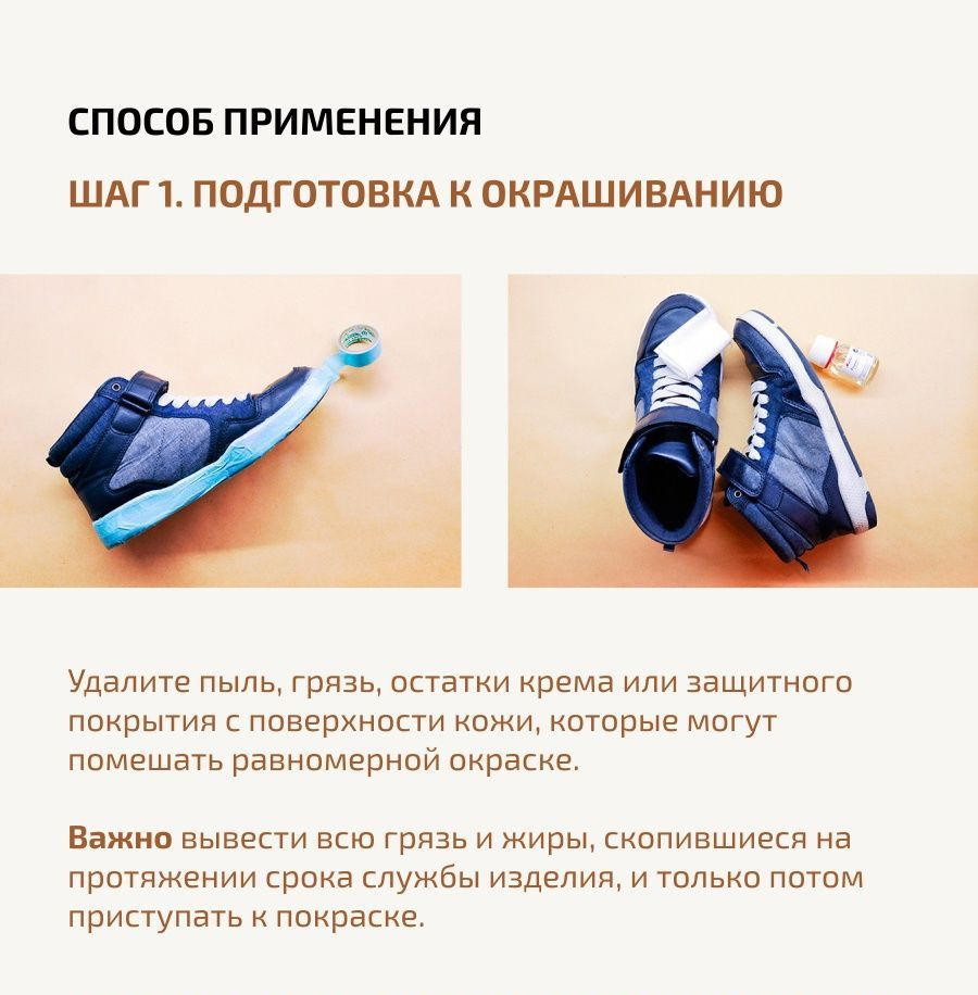 | Дополнительная информация | Стойкий краситель для всех видов натуральных и синтетических гладких кож. Глубоко проникает в структуру кожи, качественно окрашивает и перекрашивает любой цвет в более темный. Эффективно устраняет потертости и царапины, обновляя верхний слой кожи. Отличается высокой стойкостью, не растрескивается. Придает водоотталкивающий эффект. При высыхания образует блеск, дополнительная полировка не требуется. |