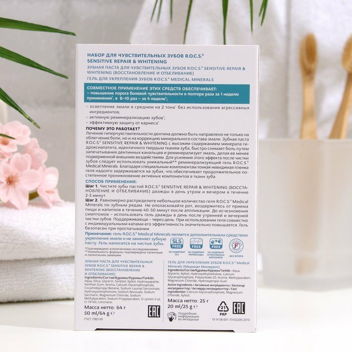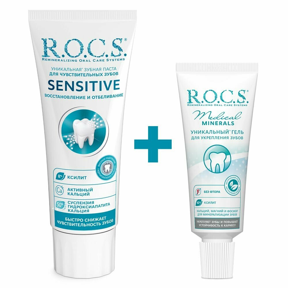 Набор R.O.C.S. для чувствительных зубов Sensitive Repair & Whitening: зубная паста 64 г + реминерализующий гель 25 г