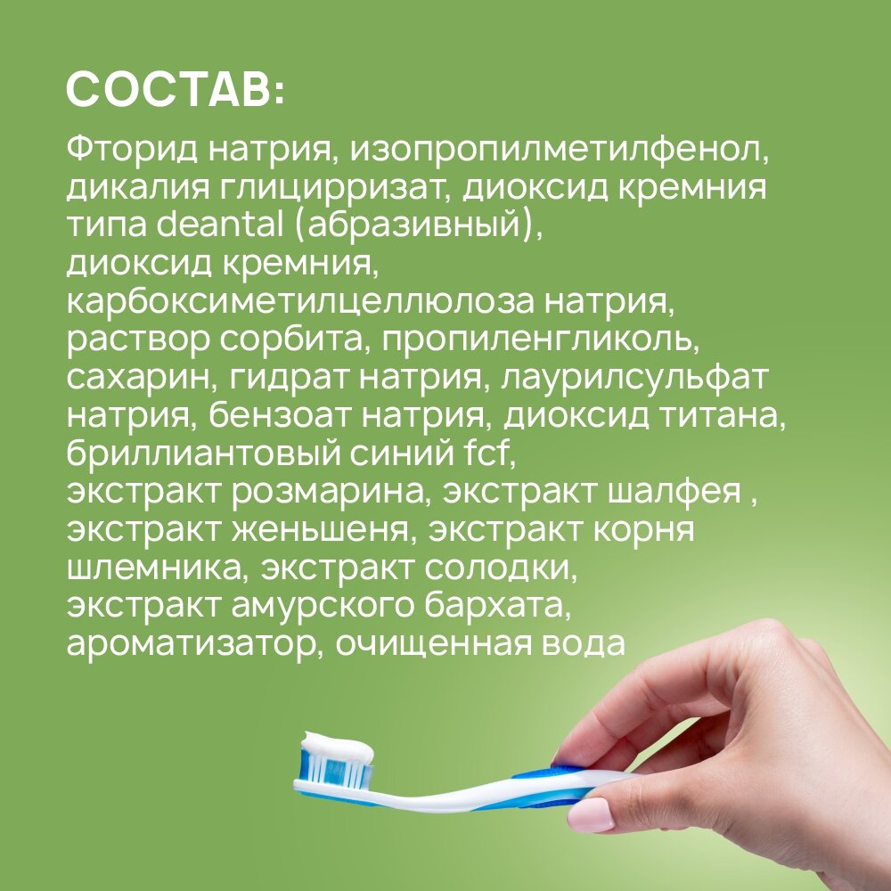 | Назначение | антибактериальный эффект / для десен / для чувствительных зубов / комплексный уход / от кариеса / отбеливание / при кровоточивости десен / свежее дыхание / укрепление эмали |