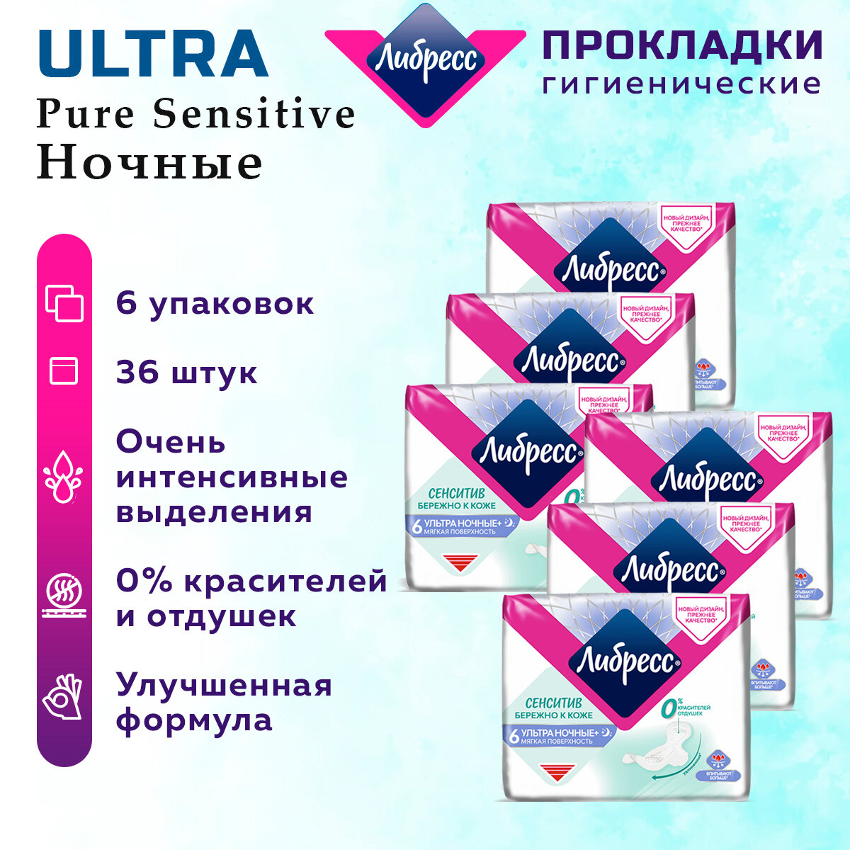Libresse Прокладки гигиенические Ultra Pure Sensitive, Ночные, 6 шт в уп
