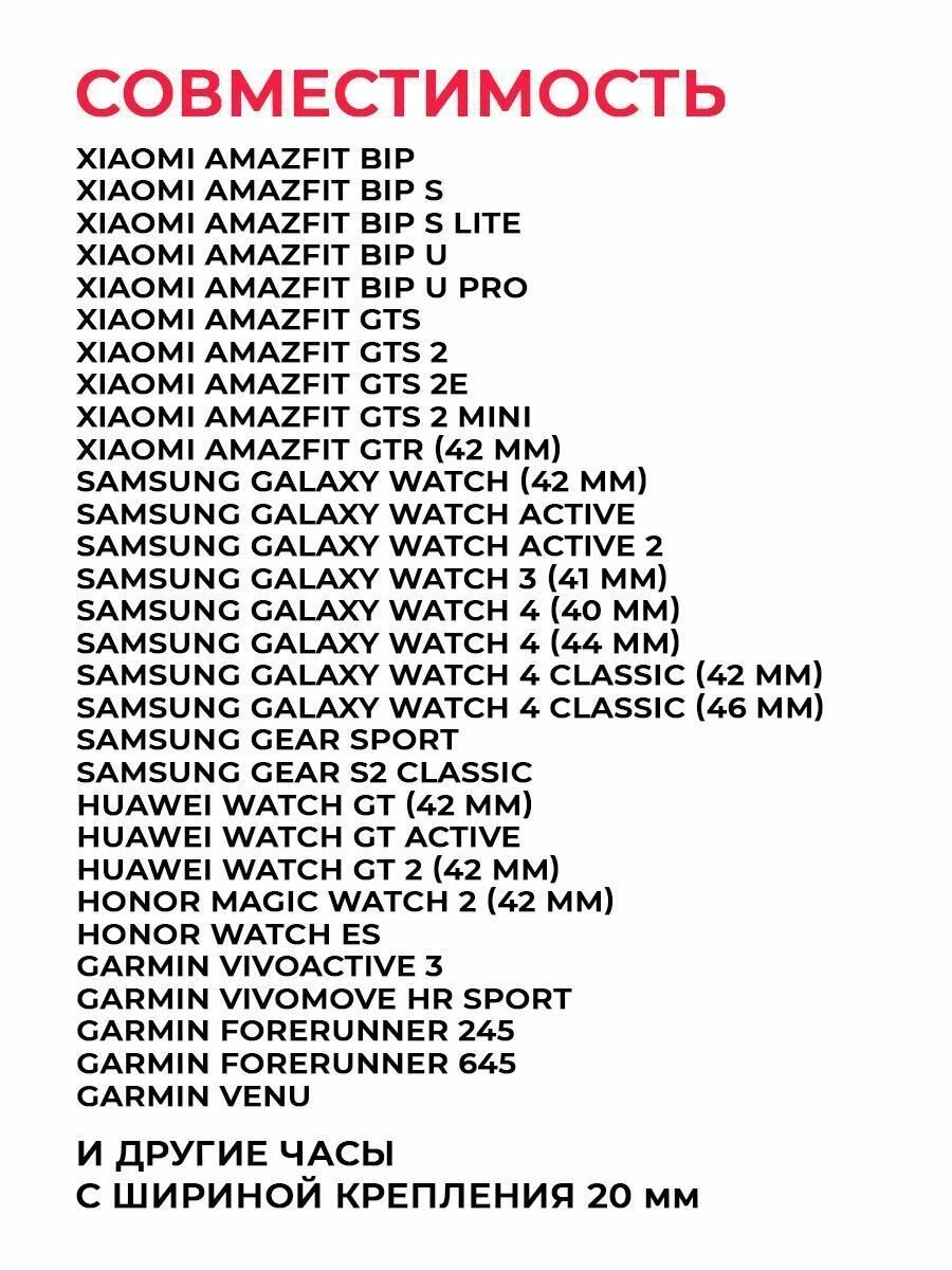 | Совместимые модели умных часов | Amazfit Bip, Amazfit Bip Lite, Amazfit Bip S, Amazfit Bip S Lite, Amazfit Bip U Pro, Amazfit GTR 42 мм, Amazfit GTS, Amazfit GTS 2, Amazfit GTS 2 mini, Amazfit GTS 2e, Amazfit GTS 3, Amazfit GTS 4 mini, Amazfit Zepp E Circle, Garmin Forerunner 245, Garmin Forerunner 245 music, Garmin Forerunner 645, Garmin Venu, Garmin Venu Sq, Garmin Vivoactive 3, Garmin Vivoactive 3 Music, Garmin Vivomove 3, Garmin Vivomove HR, Garmin Vivomove Luxe, Garmin Vivomove Style, Haylou LS02, Haylou RS4 LS12, Haylou RS4 PLUS, Honor MagicWatch 2 42 мм, Honor Watch ES, Huawei Watch 2, Huawei Watch GT2 42 мм, Huawei Watch GT3 42 мм, Samsung Galaxy Watch 42 мм, Samsung Galaxy Watch Active, Samsung Galaxy Watch Active2 40мм, Samsung Galaxy Watch Active2 44 мм, Samsung Galaxy Watch3 41 мм, Samsung Gear S2, Samsung Gear S2 Classic, Samsung Gear Sport, realme TechLife Watch S100, realme Watch (RMA 161) |