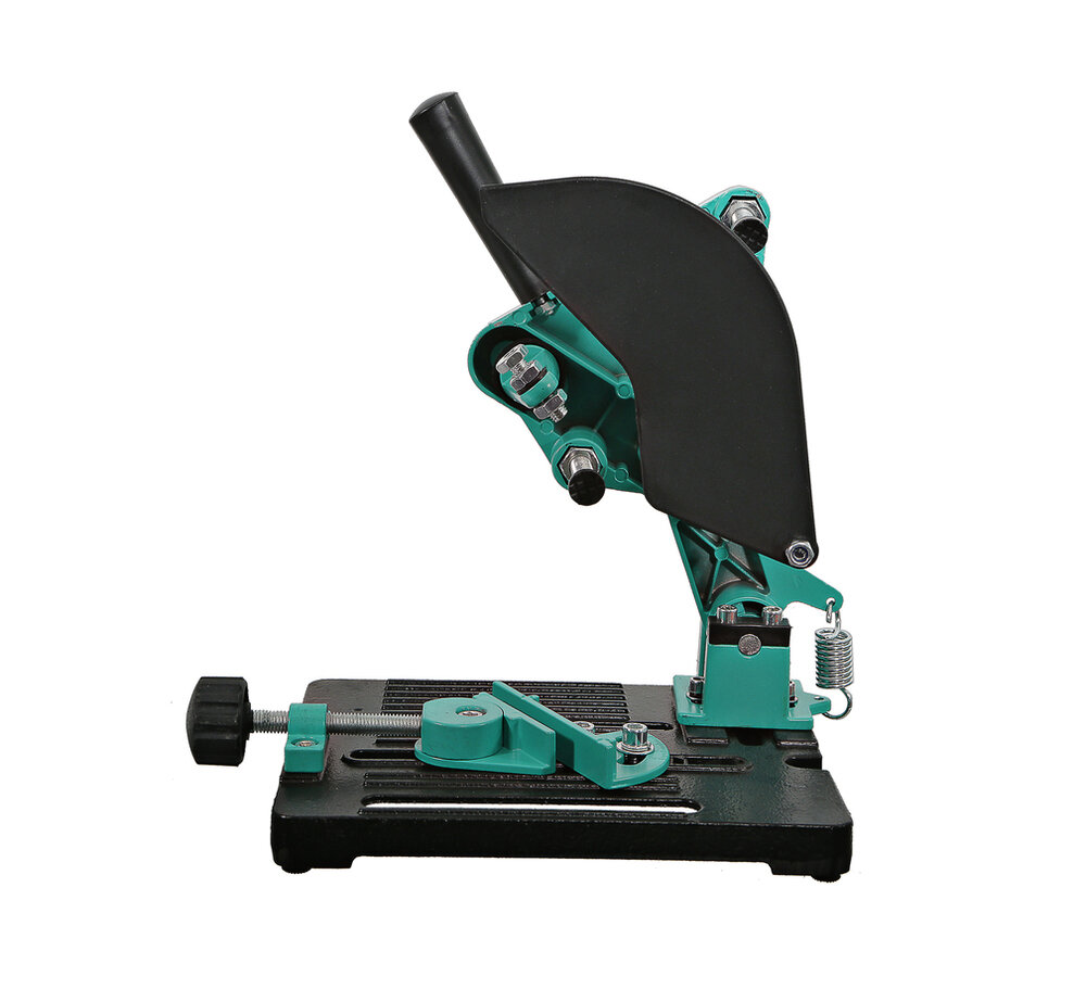 | Дополнительная информация | защита от искр; тиски для зажима детали под углом 45; угол поворота тисков относительно стола (°): 0-45; размер основания (мм): 190х235; для крепления болгарок с диаметром диска 115/125 мм |