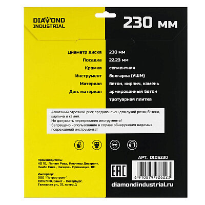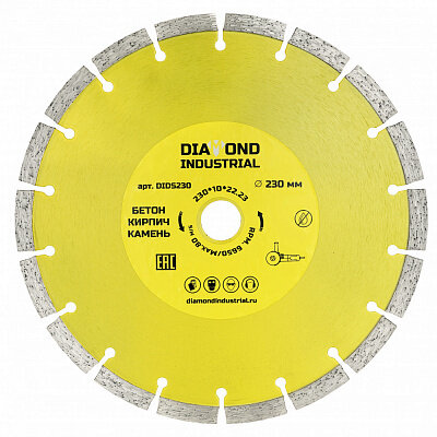 СохранитьАлмазный диск отрезной 230х22,23 мм Сегментный DIDS230 Diamond Industrial по бетону, кирпичу, камню интересное: