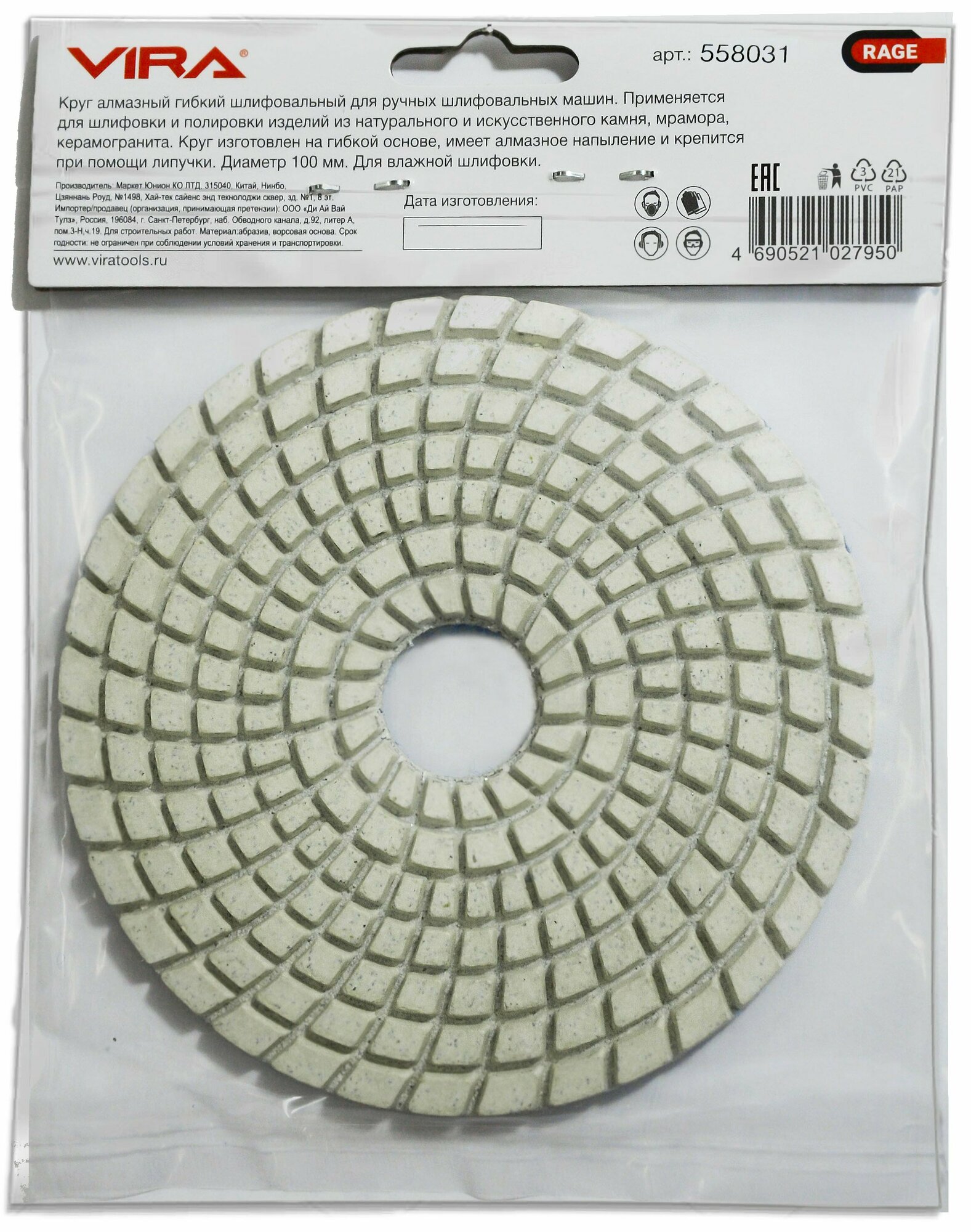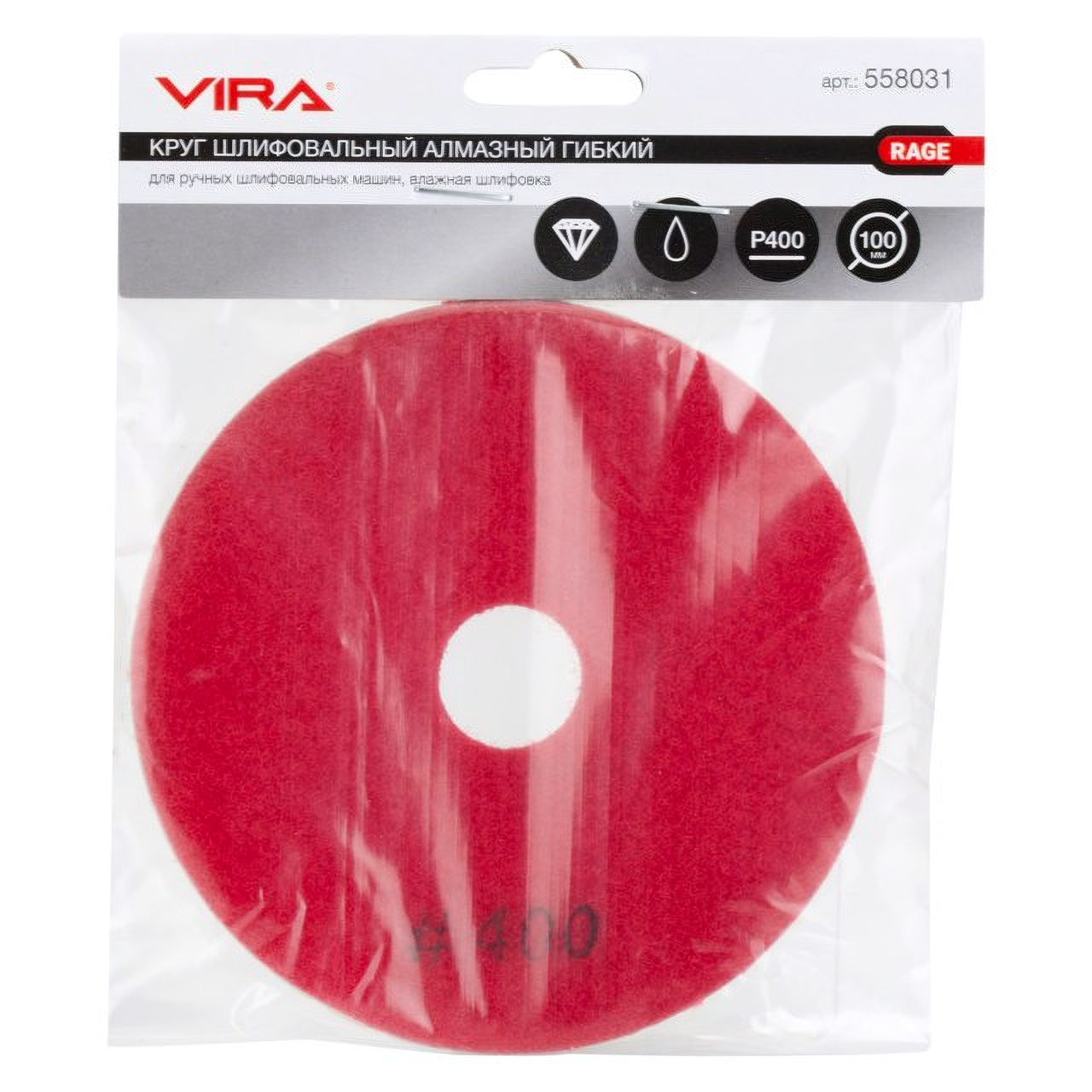 | Дополнительная информация | Круг шлифовальный алмазный VIRA RAGE гибкий 100мм Р50 |