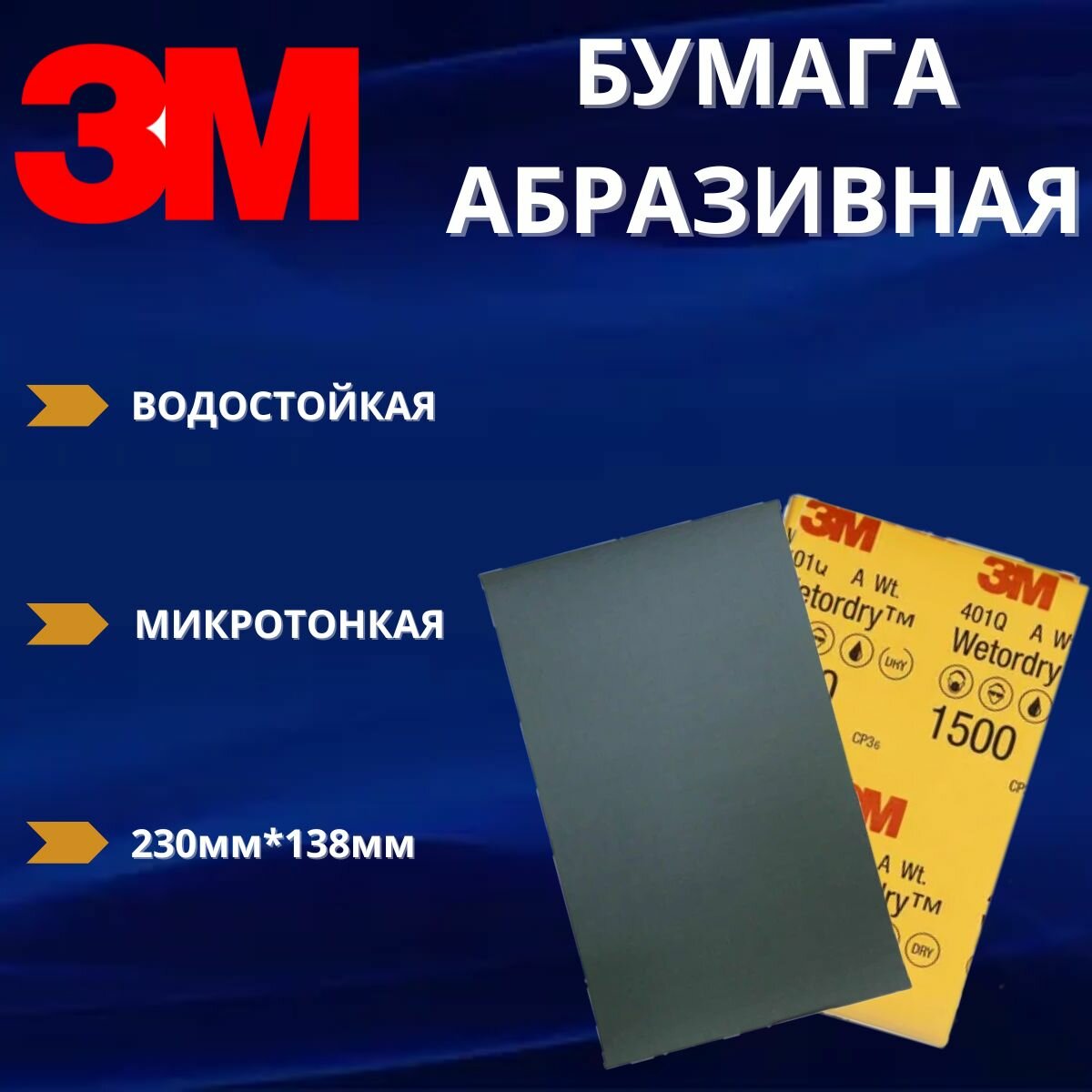Микротонкий водостойкий абразивный шлифовальный лист 3M™ арт. 02048 Wetordry™ 401Q P1500 (наждачная бумага / наждачка), 138x230 мм, 3 шт.