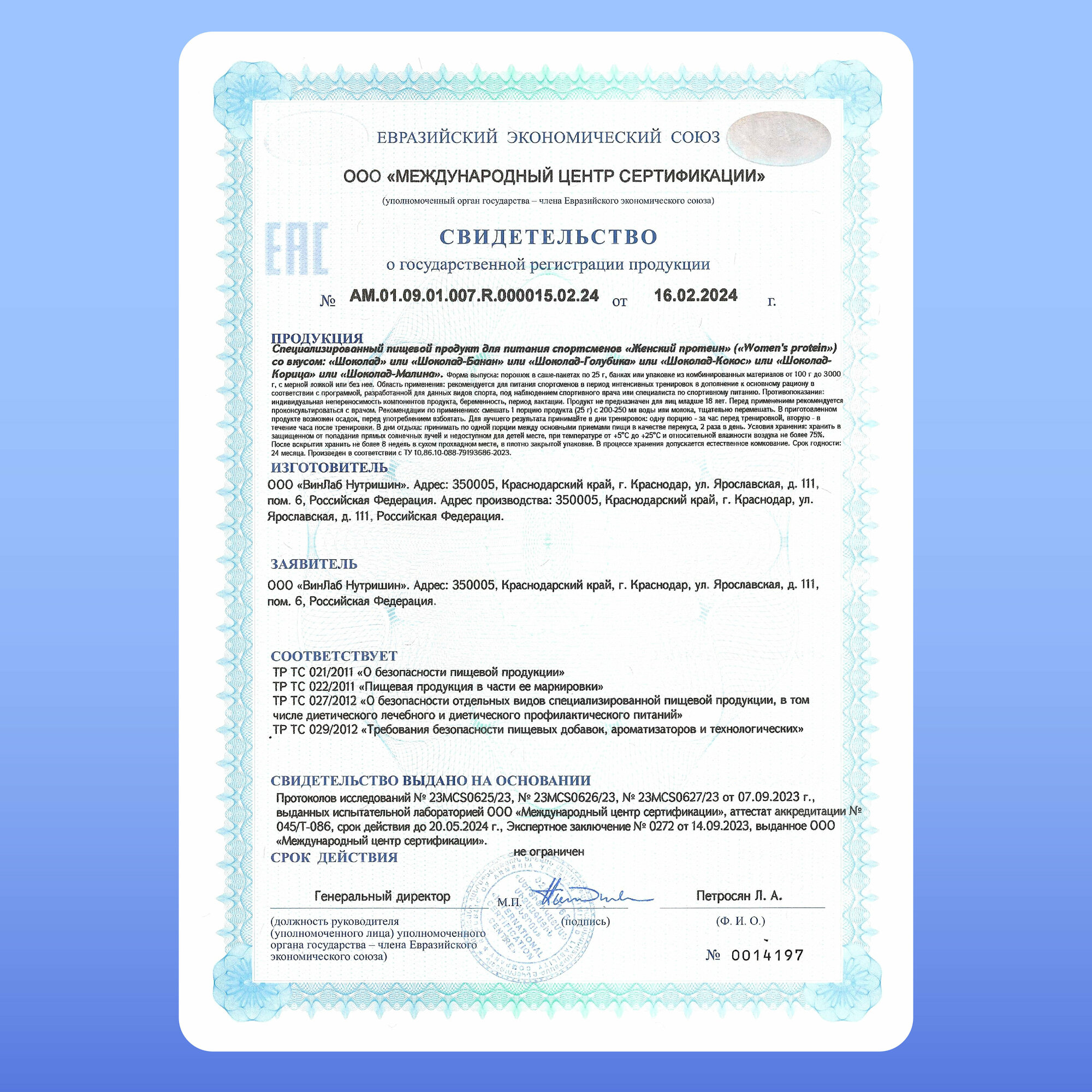 | Дополнительная информация | Состав: концентрат сывороточного белка, мальтодекстрин, молоко сухое обезжиренное, белок яичный сухой, какао-порошок, концентрат молочного белка, изолят сывороточного белка, карбоксиметилцеллюлоза натриевая соль (стабилизатор), витаминный премикс (L-аскорбиновая кислота, DL-α-токоферола ацетат, ниацин, кальция пантотенат, пиридоксина гидрохлорид, тиамина гидрохлорид, рибофлавин, фолиевая кислота, биотин, цианокобаламин), ароматизатор, сукралоза (подсластитель). |
